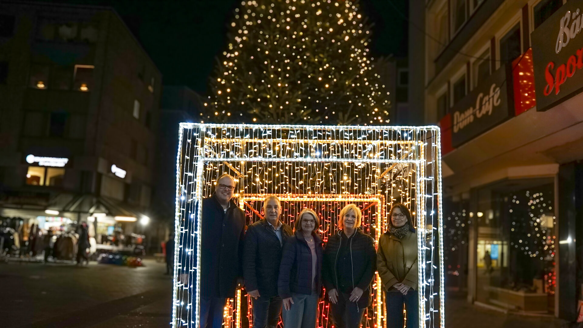 Auch am Kirchplatz wurde gestern eine große, festlich geschmückte Tanne feierlich illuminiert. Organisiert durch die städtische Wirtschaftsförderung und mit freundlicher Unterstützung der Stadtsparkasse Bottrop sowie des Vereins für Marketing in Bottrop e.V. entstand dort ein besonderes Highlight: Eine interaktive Lichtinstallation vor der Tanne bietet ein außergewöhnliches Fotomotiv, das bereits am ersten Abend von zahlreichen Passantinnen und Passanten begeistert genutzt wurde.