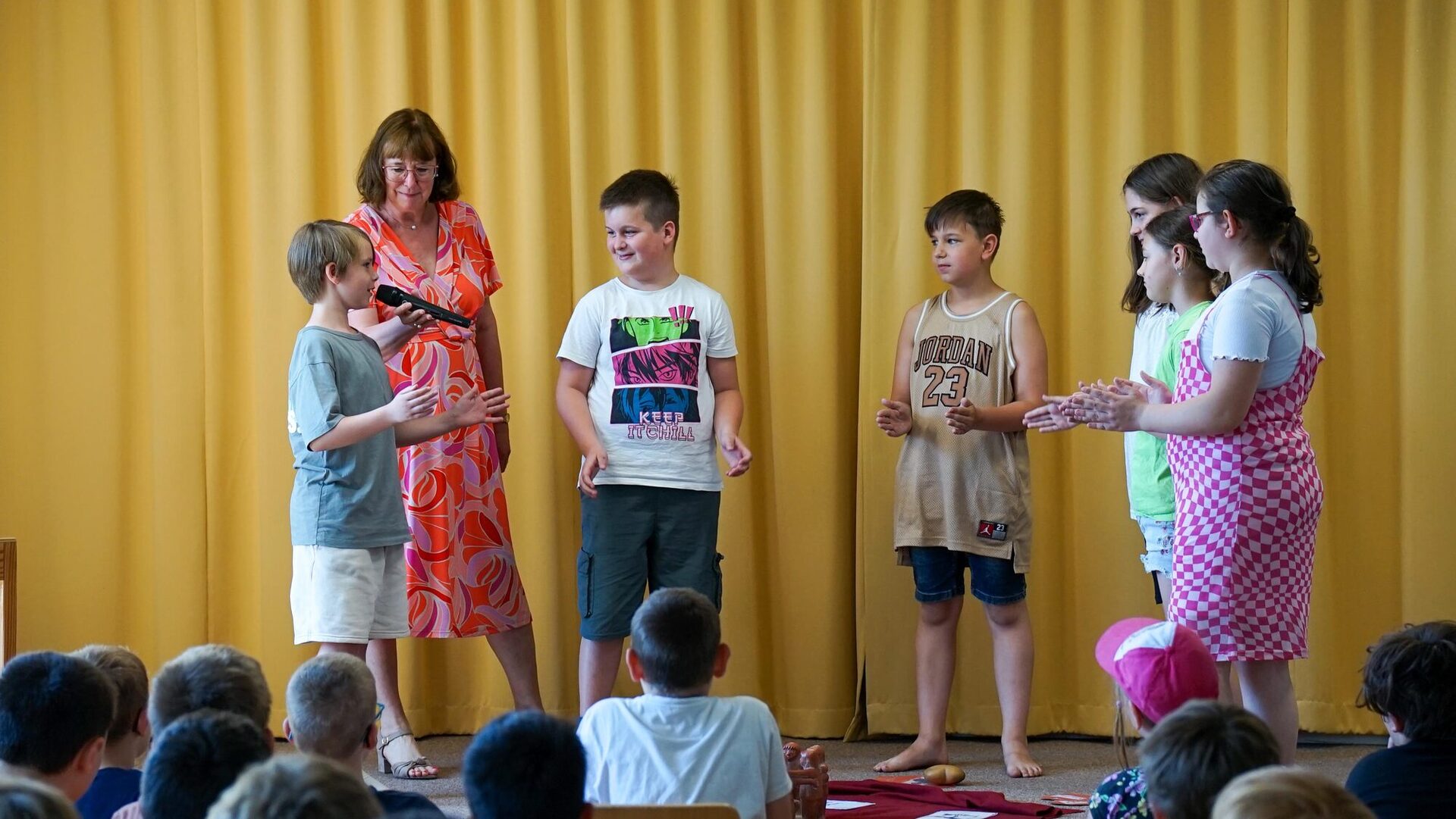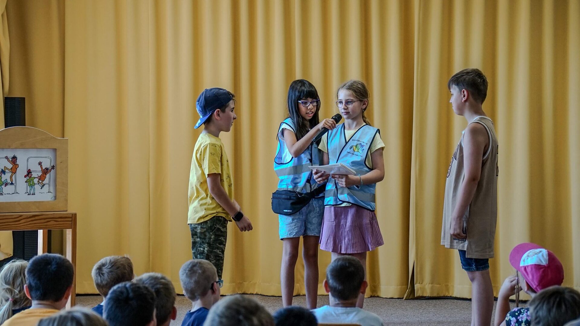 Im Rahmen der feierlichen Urkundenübergabe zeigten die Schülerinnen und Schüler der Schule am Stadtgarten eine Streitschlichtung in der Praxis und präsentierten ihr Morgenritual, bei dem sie sich zu Beginn des Schultages gegenseitig erkundigen, wie es ihnen geht.