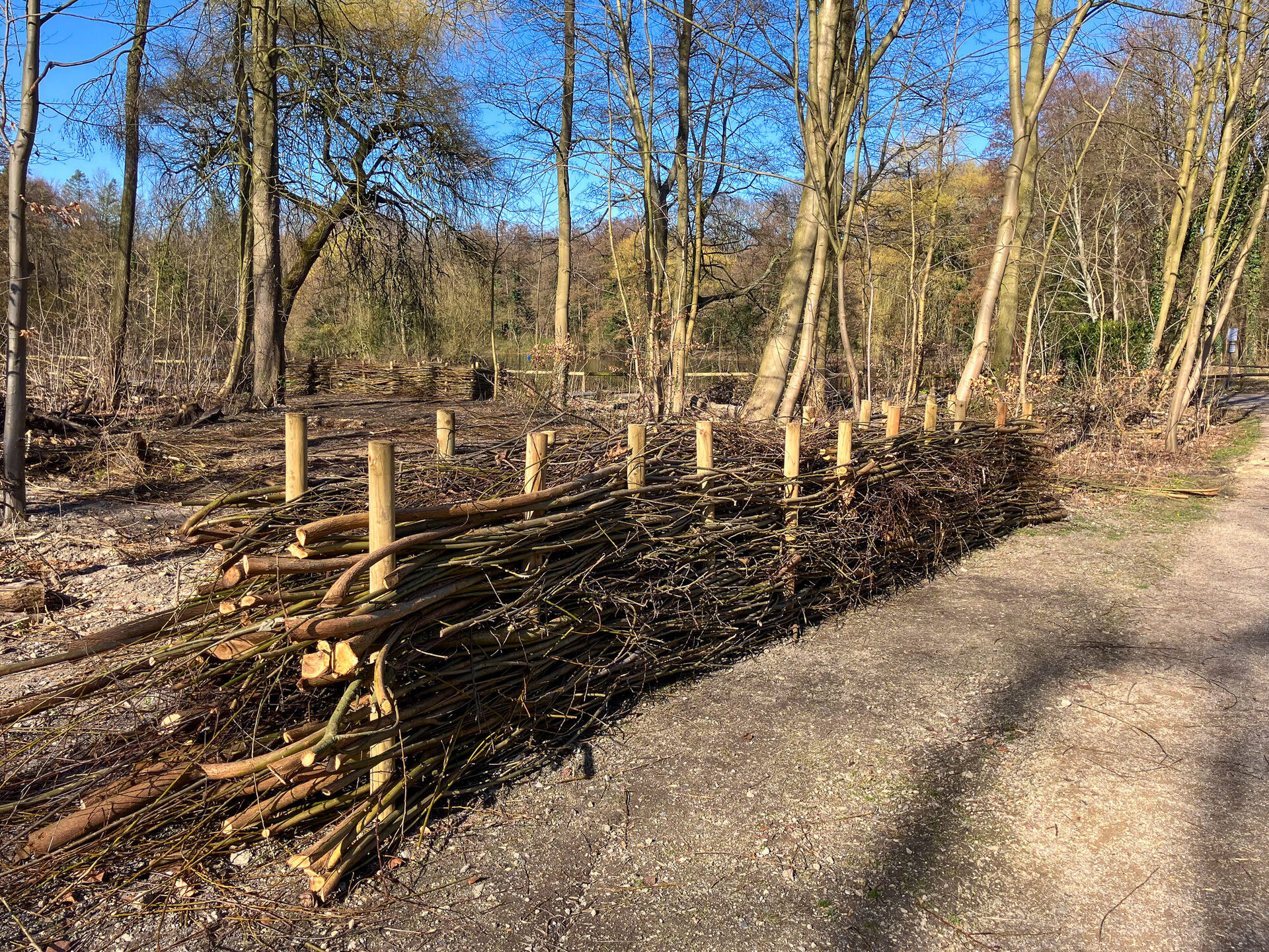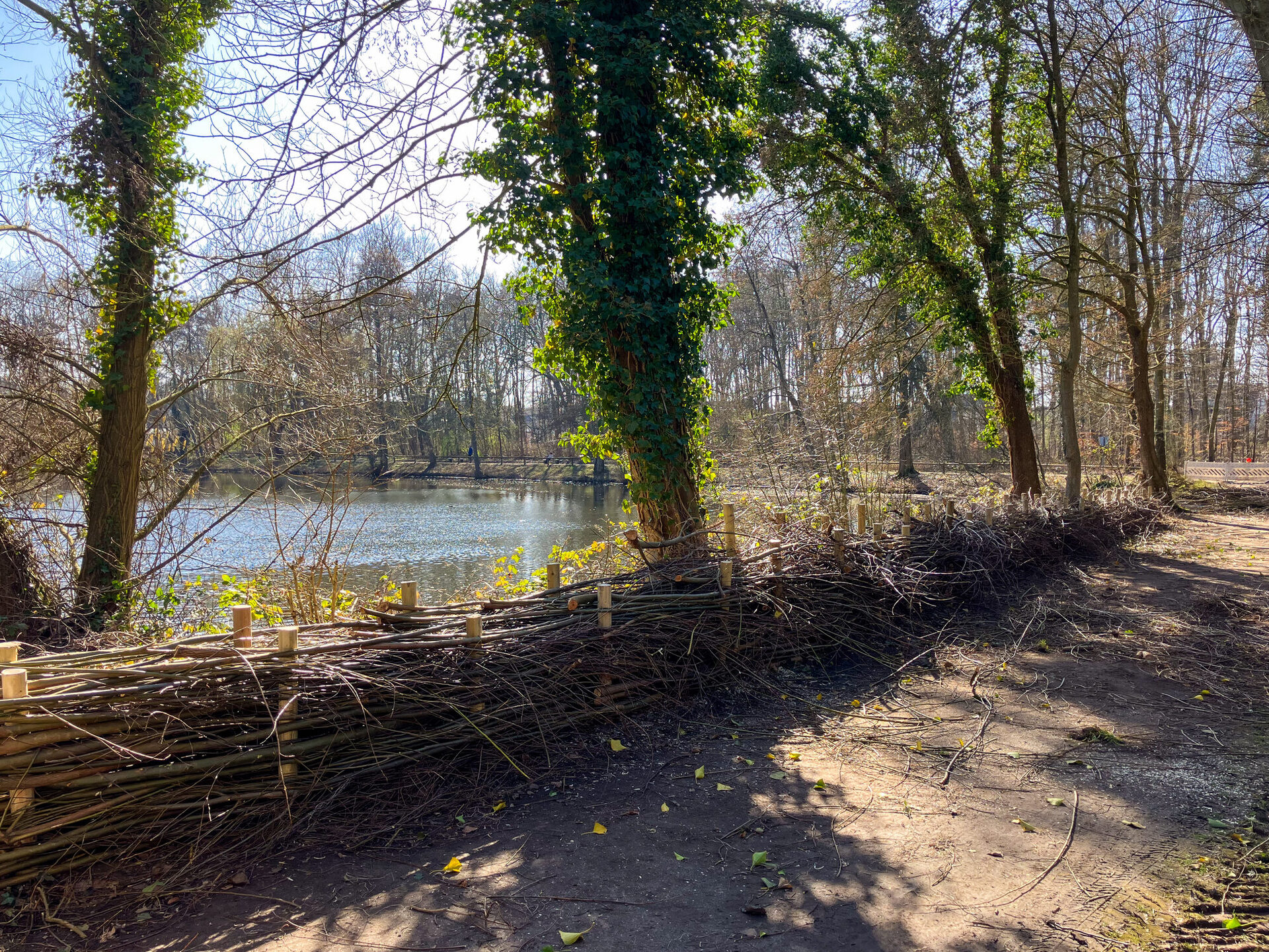 Am Nordrand des linken Teiches, westlich des Bernhard-Jäger-Weges, wurde ein maroder Holzzaun entfernt und durch eine naturnahe Benjeshecke ersetzt. Diese dient nun als natürliche Begrenzung des Gewässers und fügt sich harmonisch in die Umgebung ein.