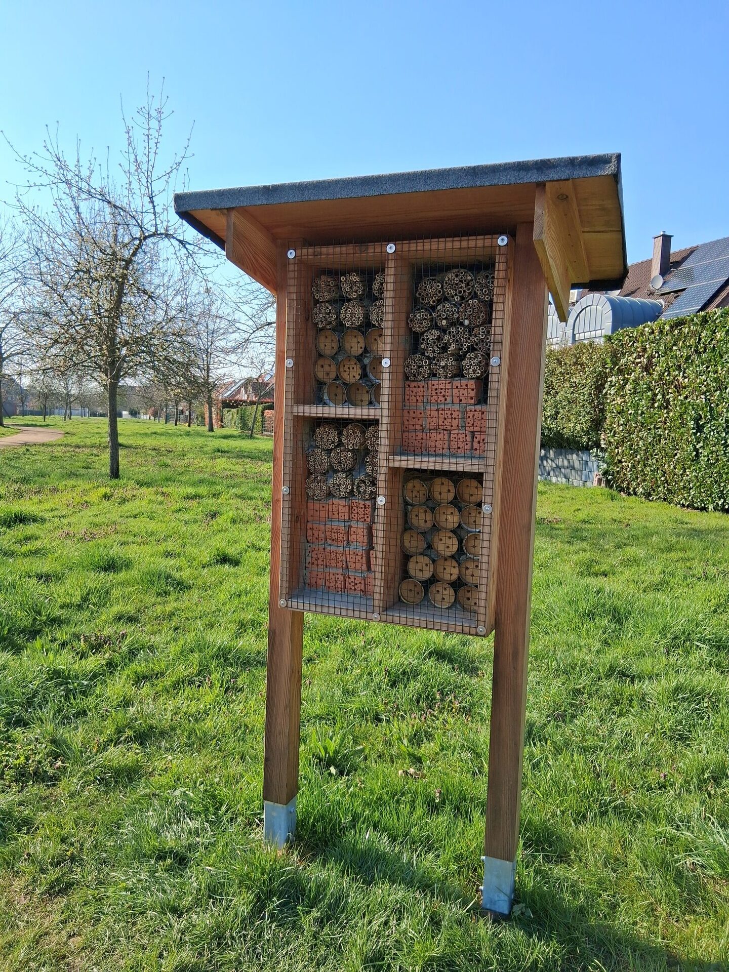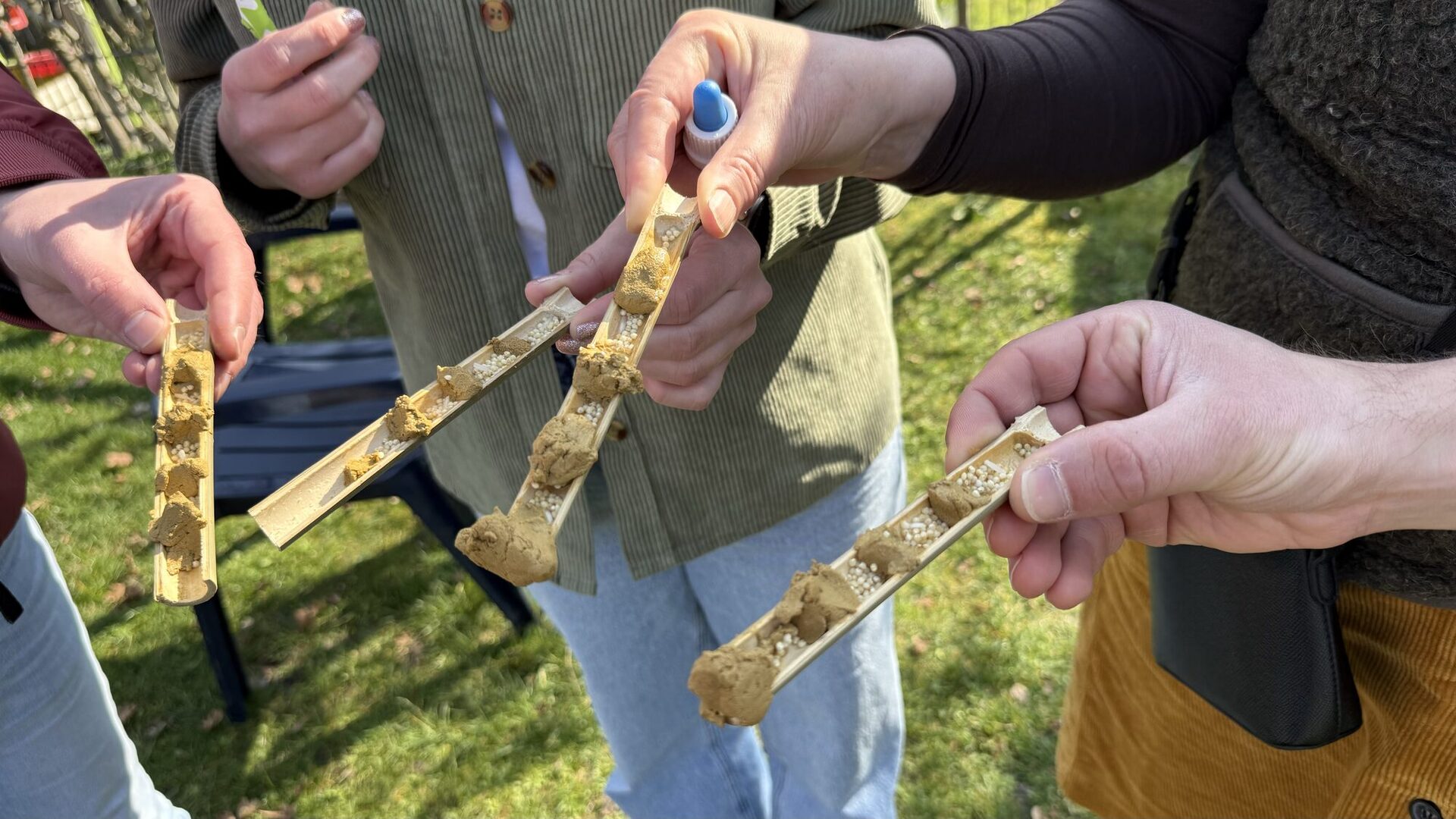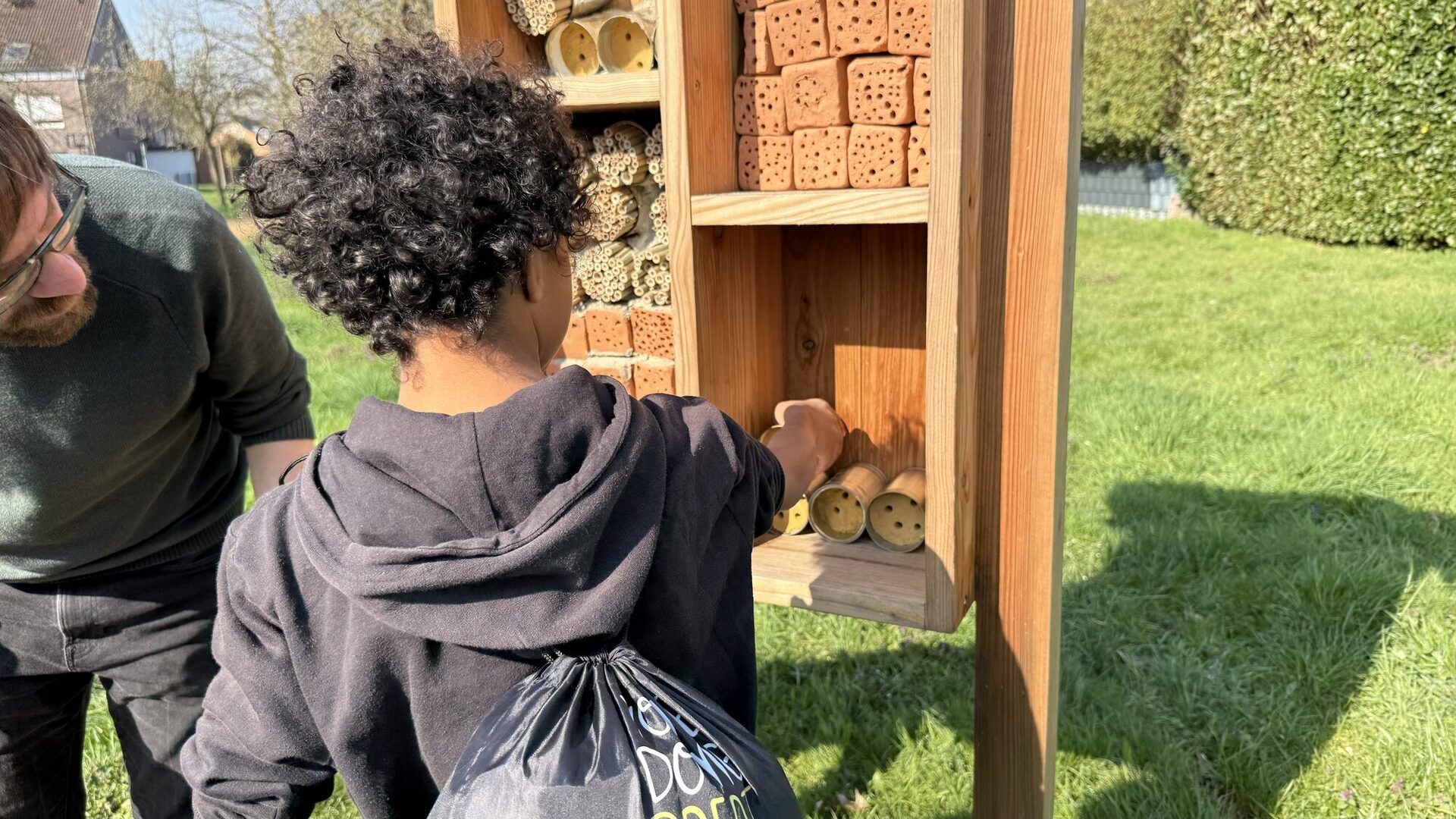Im praktischen Teil des Projekts wurden die Kinder selbst aktiv: Sie fertigten verschiedene Nisthilfen an, darunter Tonsteine, hohle Pflanzenstängel und Dosen mit einer Lehm-Löss-Mischung. Am 19. März [TM1] setzten die Schülerinnen und Schüler nun ihre selbst gebauten Elemente gemeinsam mit Volker Fockenberg sowie Mitarbeiterinnen und Mitarbeitern des Fachbereichs Umwelt und Grün in eine eigens errichtete Nistwand ein.