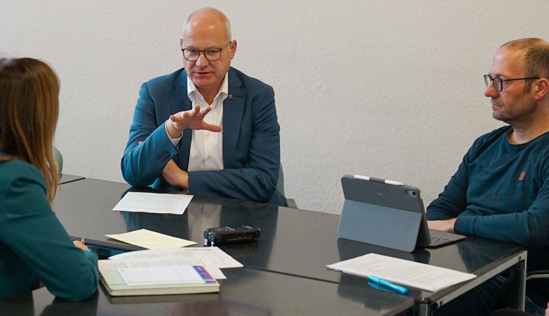 Dezernent Klaus Müller, Henrik Reiter und Helen Cammerzell von der Stadterneuerung sprechen über die kommunale Klimastrategie