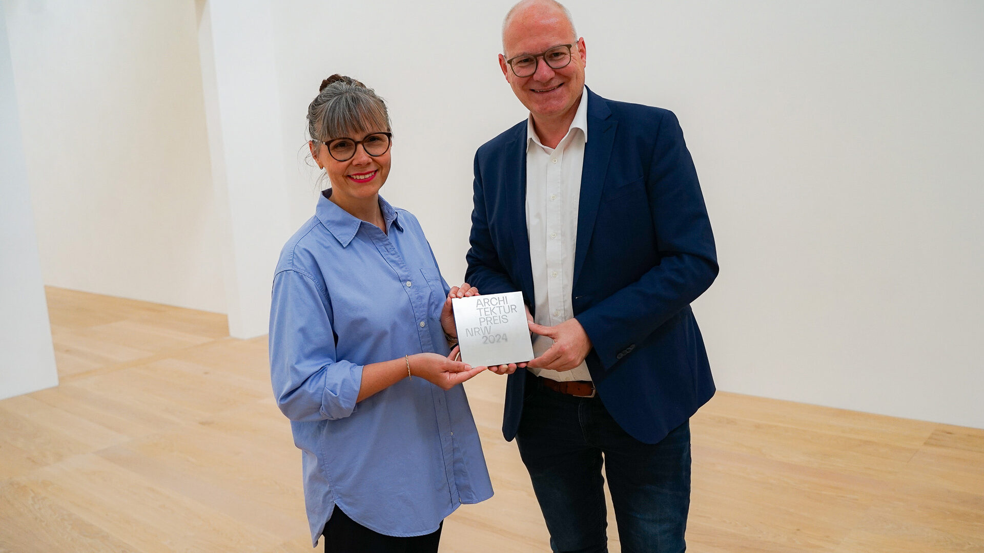 Die quadratische, silberne Plakette hat er direkt an Dr. Linda Walther, Direktorin des Josef Albers Museums Quadrat weitergereicht. „Durch den Anbau hat das Museumszentrum Quadrat acht überaus qualitätvolle Ausstellungsräume hinzubekommen,“ unterstreicht sie. „Sie geben uns die Möglichkeit, große internationale Projekte umzusetzen, wie die erste museale Einzelausstellung der US-amerikanischen Künstlerin Sheila Hicks in Deutschland, die wir am 12. Oktober eröffnen. Hinzugekommen sind ebenfalls zwei wunderbare Werkräume für die Bildung und Vermittlung, sodass wir ein reiches Programm an Workshops und Führungen anbieten können, die bei unseren Besucher*innen sehr beliebt sind. Der Anbau von Annette Gigon ist also nicht nur von herausragender ästhetischer Qualität, sondern er eröffnet uns ganz neue Möglichkeiten der in Museumsarbeit.“