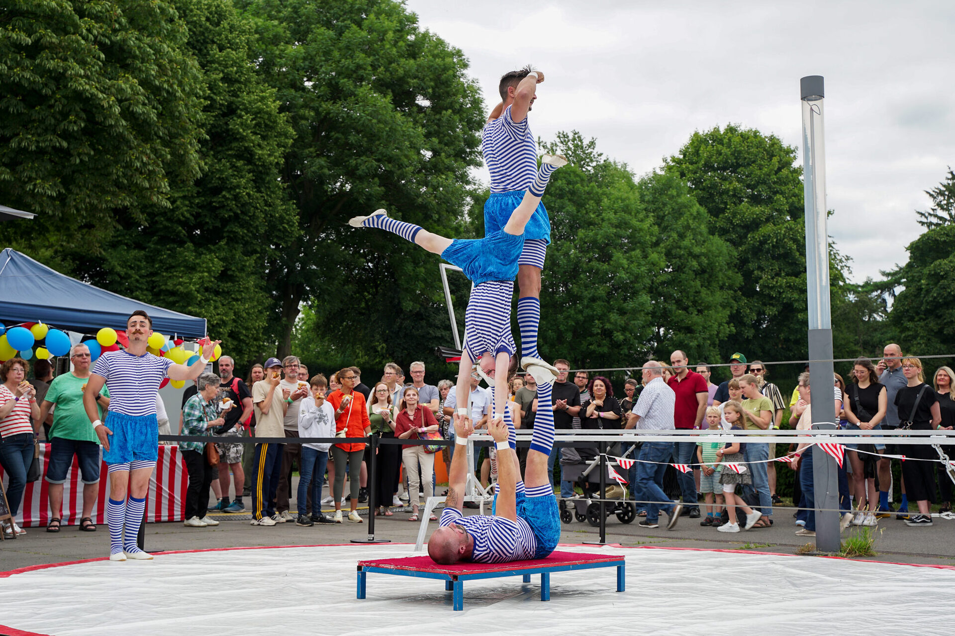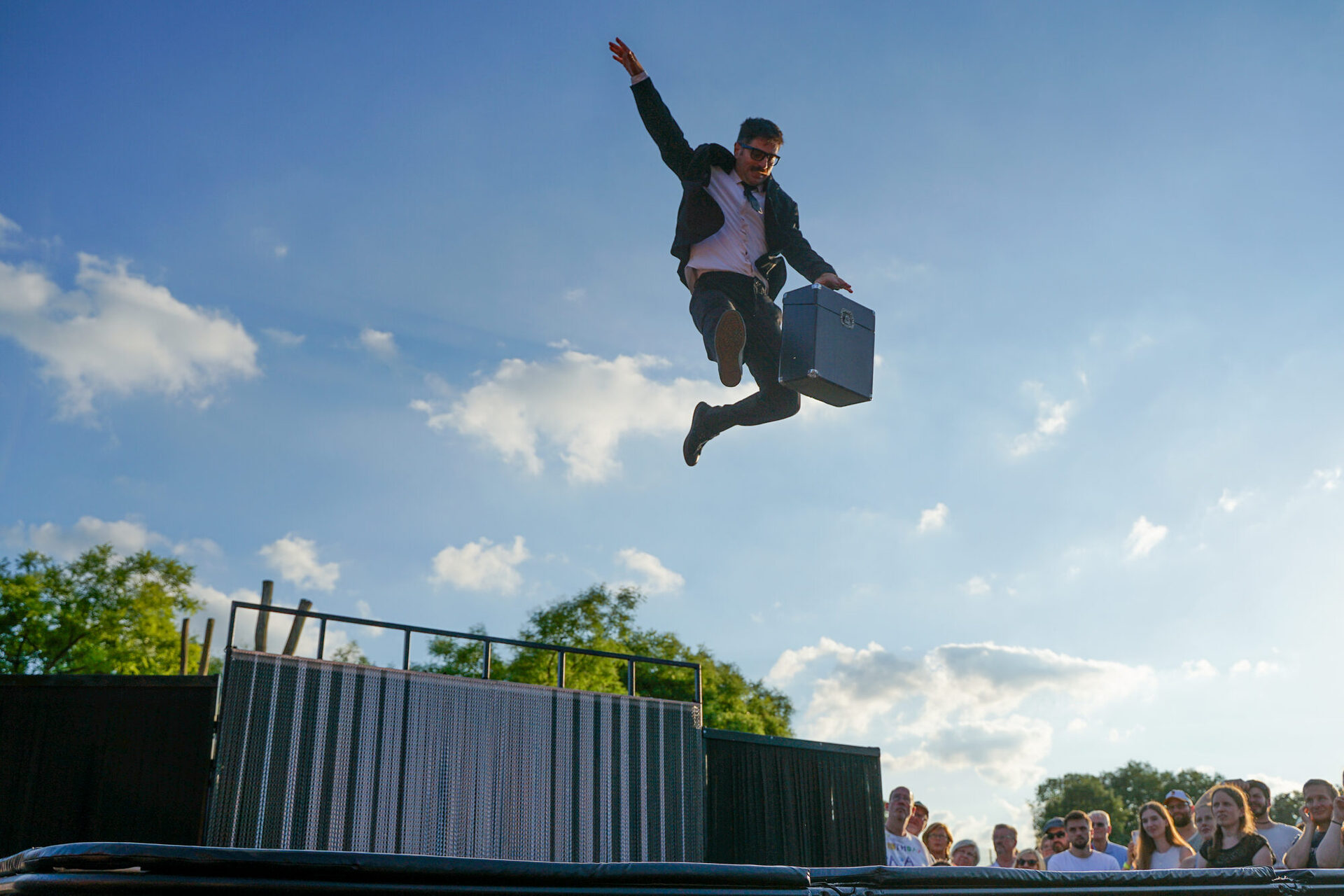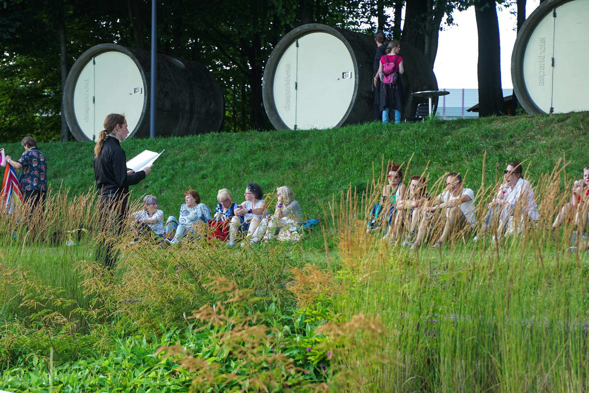 Das Programm im BernePark stand ganz im Zeichen von Artistik, Musik und außergewöhnlicher Performance. Die ArtistInnen des Circus Casselly verzauberten das Publikum mit Jonglage, spektakulärer Hula-Hoop-Performance und eindrucksvoller Akrobatik – darunter die energiegeladene Nummer „Die Alten Kameraden“. Die Trampolinkünstler von Planeta Trampoli trotzten bei ihrer Show Back2Classics scheinbar der Schwerkraft und begeisterten mit akrobatischen Höchstleistungen auf dem Trampolin. Für die musikalische Note des Abends sorgte Tante Friedl, deren handgemachte Folk-Musik zum Verweilen, Tanzen und Träumen einlud. Ein weiterer besonderer Programmpunkt war die Live Writing Session, die außerhalb des Veranstaltungsgeländes bis in die frühen Morgenstunden andauerte. Und beim Künstlergespräch mit Vera Vorneweg um 20:15 Uhr erhielten BesucherInnen spannende Einblicke hinter die Kulissen der künstlerischen Arbeit.