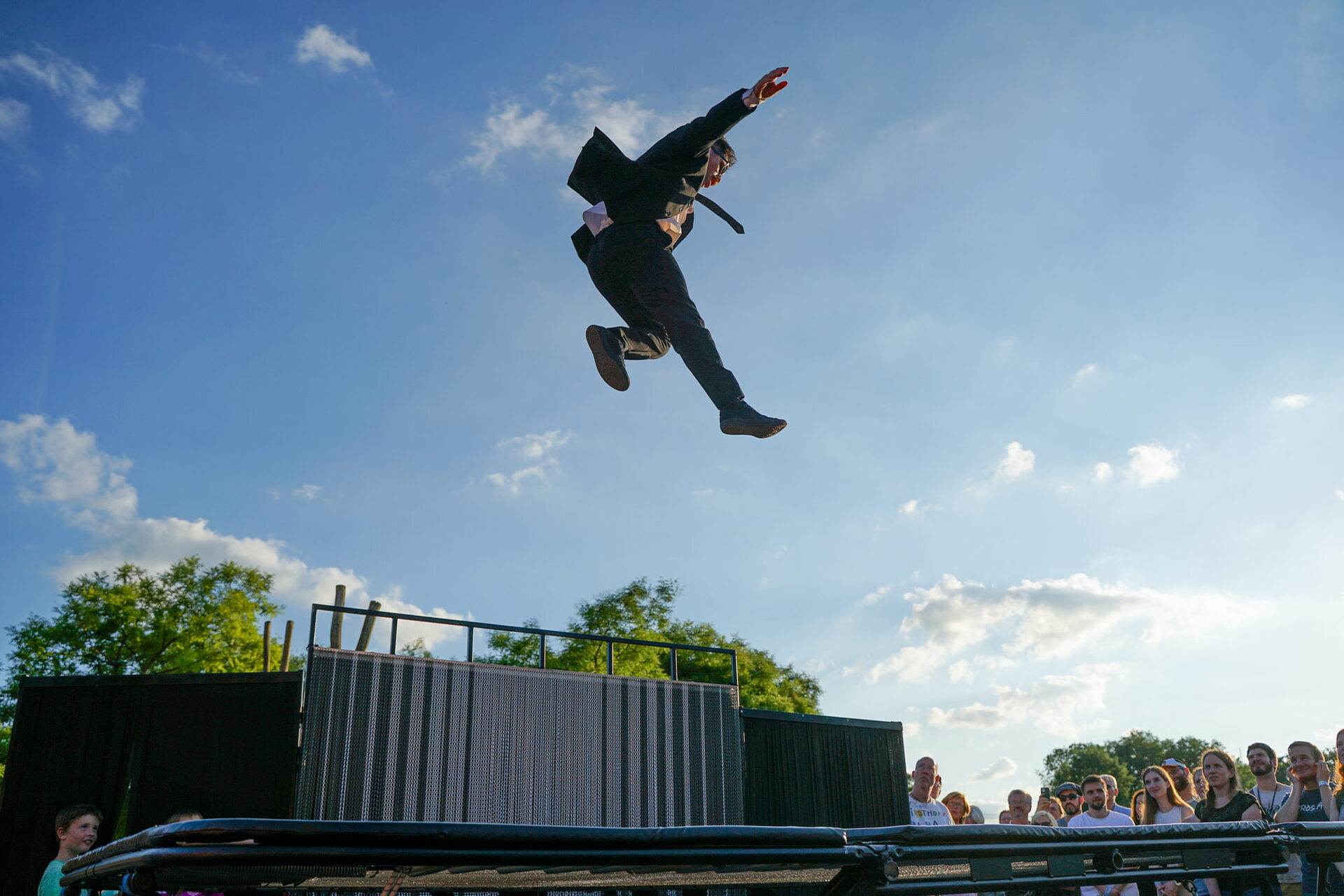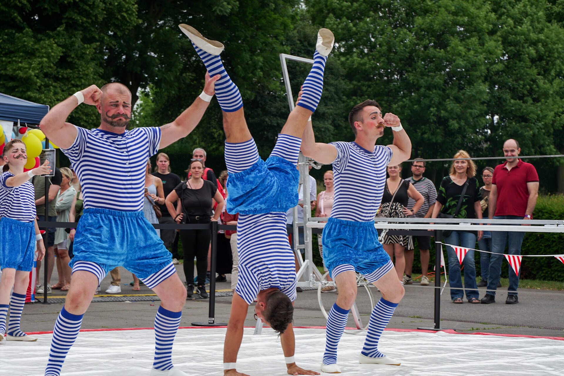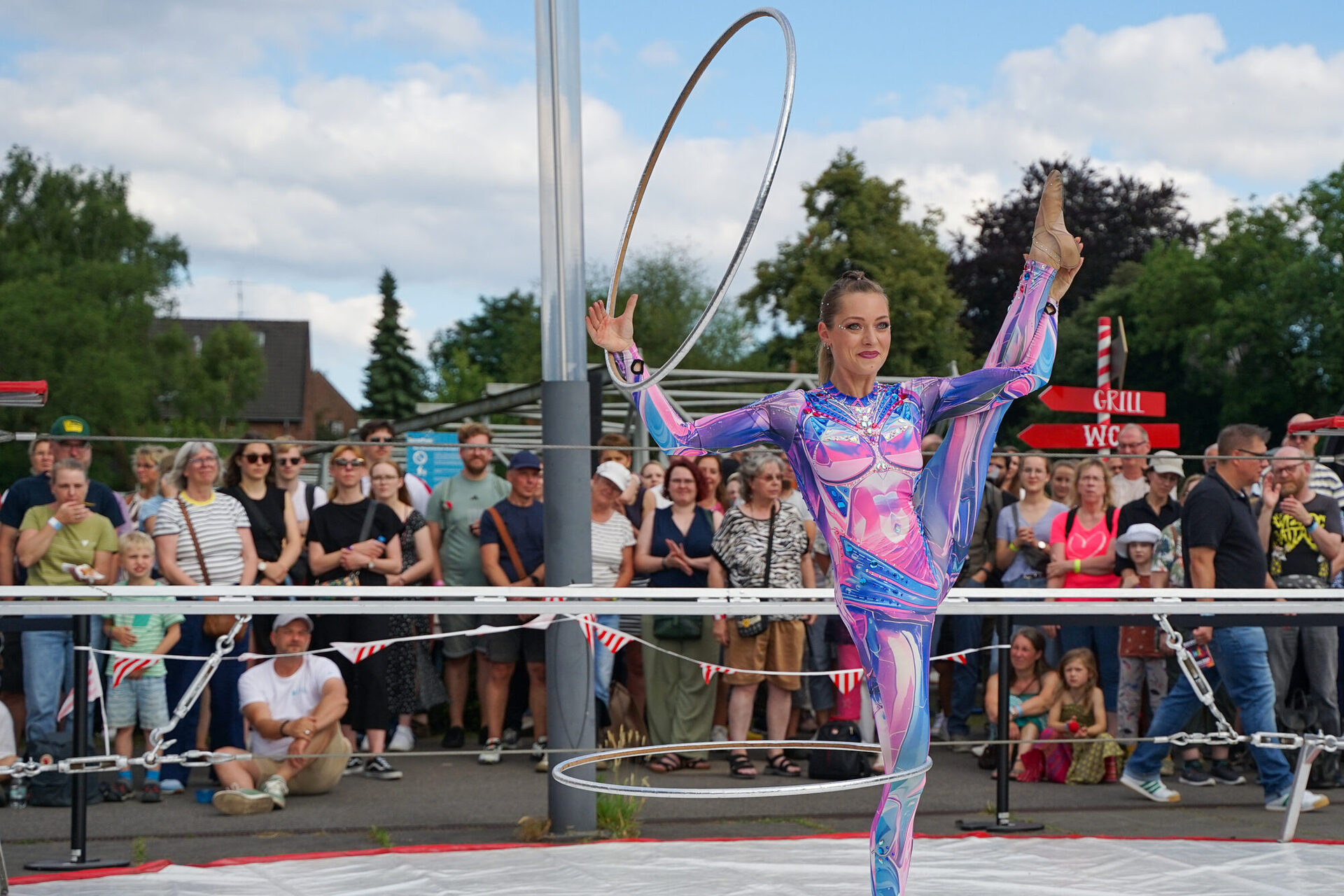 Das Programm im BernePark stand ganz im Zeichen von Artistik, Musik und außergewöhnlicher Performance. Die ArtistInnen des Circus Casselly verzauberten das Publikum mit Jonglage, spektakulärer Hula-Hoop-Performance und eindrucksvoller Akrobatik – darunter die energiegeladene Nummer „Die Alten Kameraden“. Die Trampolinkünstler von Planeta Trampoli trotzten bei ihrer Show Back2Classics scheinbar der Schwerkraft und begeisterten mit akrobatischen Höchstleistungen auf dem Trampolin. Für die musikalische Note des Abends sorgte Tante Friedl, deren handgemachte Folk-Musik zum Verweilen, Tanzen und Träumen einlud. Ein weiterer besonderer Programmpunkt war die Live Writing Session, die außerhalb des Veranstaltungsgeländes bis in die frühen Morgenstunden andauerte. Und beim Künstlergespräch mit Vera Vorneweg um 20:15 Uhr erhielten BesucherInnen spannende Einblicke hinter die Kulissen der künstlerischen Arbeit.