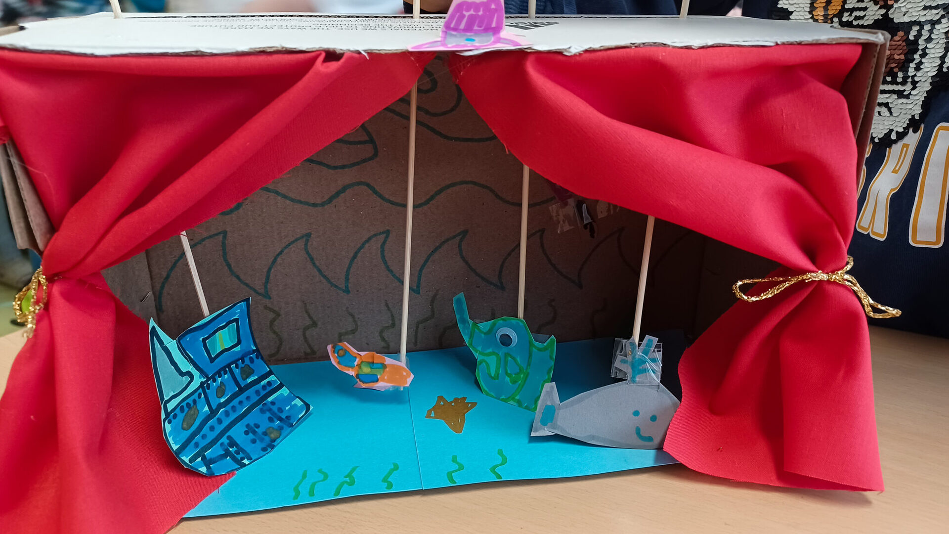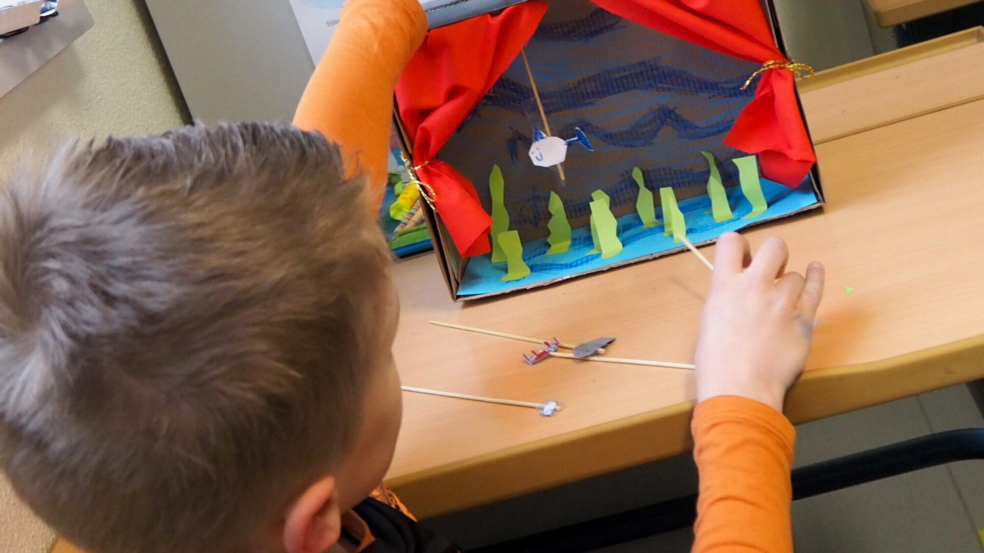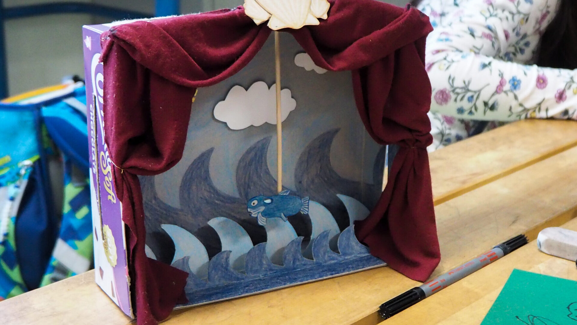 Im Anschluss an die Aufführungen wurden die Kinder selbst kreativ: unter Anleitung der Künstlerin Leonie Wanke gestalteten sie in ihren Schulen eigene Figuren und Bühnenbilder. Mit Schuhkartons als Basis entstanden bunte Unterwasserwelten, die den Schülerinnen und Schülern ermöglichten, ihre eigenen Geschichten mit selbst gebastelten Unterwasserwesen zu erzählen. Leonie Wanke ist durch ihre Arbeit mit der Kulturwerkstatt Bottrop bekannt und bietet regelmäßig Workshops im Rahmen des Kulturrucksacks sowie des Kulturwerkstatt-Programms an.