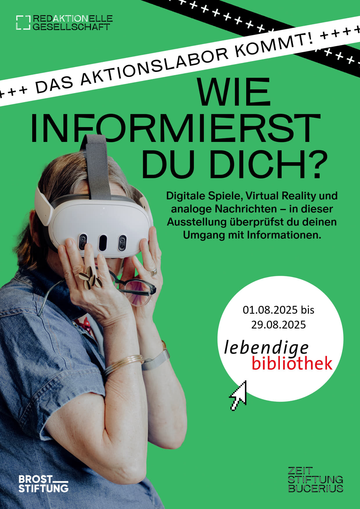 Digitale Spiele, Virtual Reality und analoge Nachrichten – hier überprüfen Besucher:innen ihren Umgang mit Informationen. Hinter dem interaktiven Aktionslabor „Redaktionelle Gesellschaft“ verbirgt sich eine mobile Ausstellung aus digitalen Stationen mit VR-Umgebung und Spielen sowie analogen Fakten rund um das Thema Nachrichtenkompetenz. Das Labor tourt bereits seit vergangenem Jahr durch Hamburg und Niedersachsen und ist seit Anfang 2025 auch in Nordrhein-Westfalen unterwegs. Vom 1. bis 29. August 2025 macht es in der Lebendigen Bibliothek (Böckenhoffstraße 12a) Halt und kann von den Gästen ausprobiert werden.