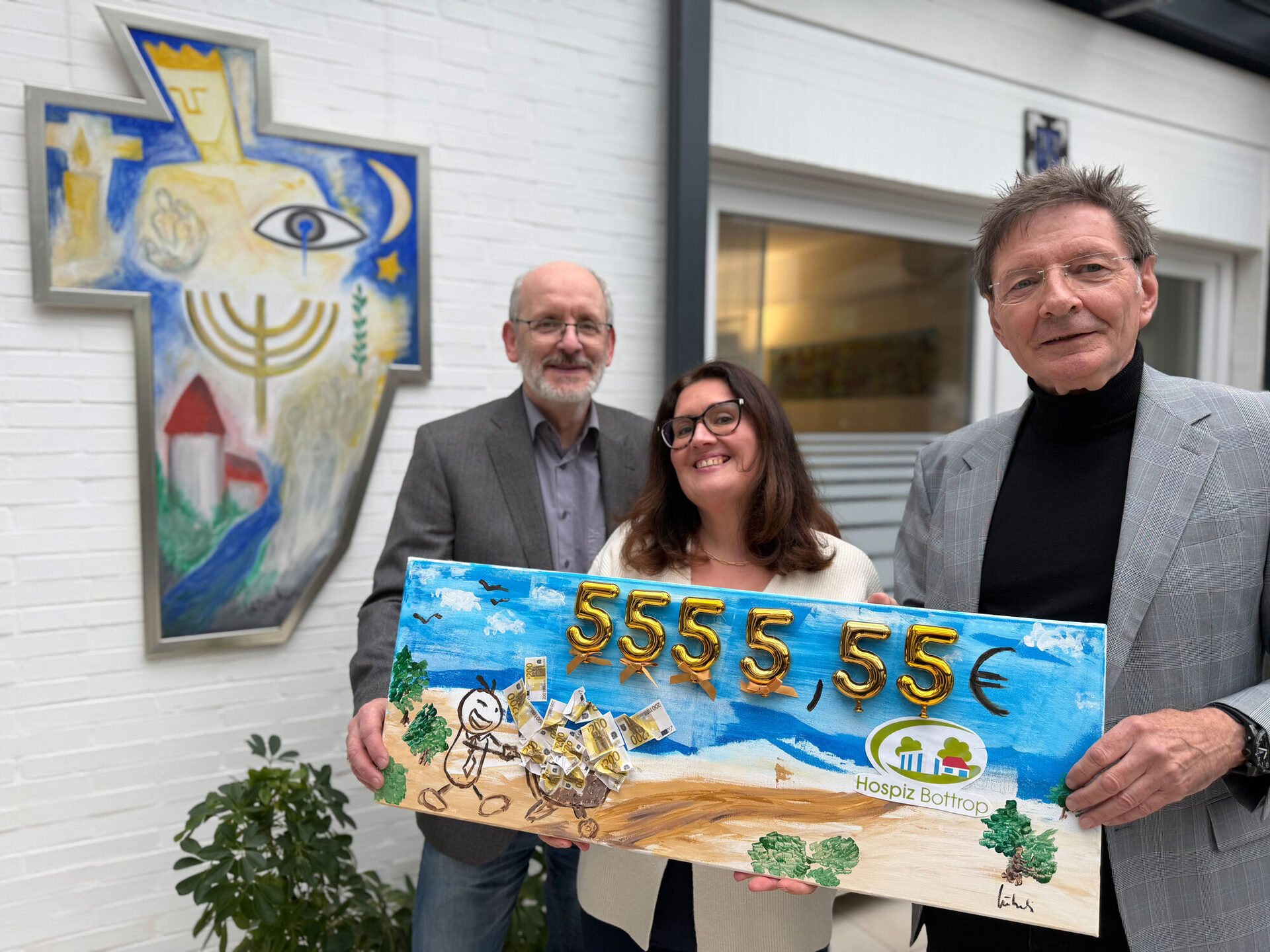 5.555 Euro hat Jennifer Lützenburg an Jürgen Münnich und Christoph Voegelin vom Bottroper Hospiz überreicht. Ende Februar hatte sie die Sammlung ihrer Mutter, der Bottroper Kulturpreisträgerin Bernhardine Lützenburg, aufgelöst und zugunsten des Hospizvereins verkauft.