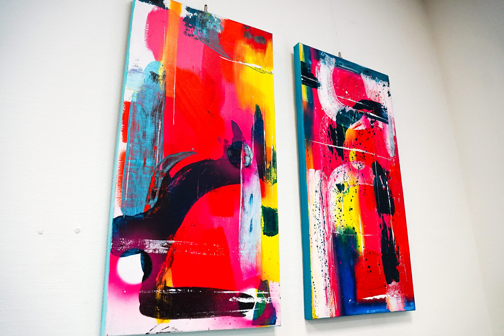 Einen Kontrast dazu bilden die abstrakten Leinwandarbeiten von Daniela Nennstiel. Die 56-jährige Künstlerin arbeitet mit intensiven Farben wie Grün, Pink oder Lila und nutzt dabei unterschiedlichste Techniken. Neben klassischen Malmethoden kommen unter anderem Sprühtechniken sowie experimentelle Materialien wie Kaffeesätze in Kombination mit Vinylkleber zum Einsatz.