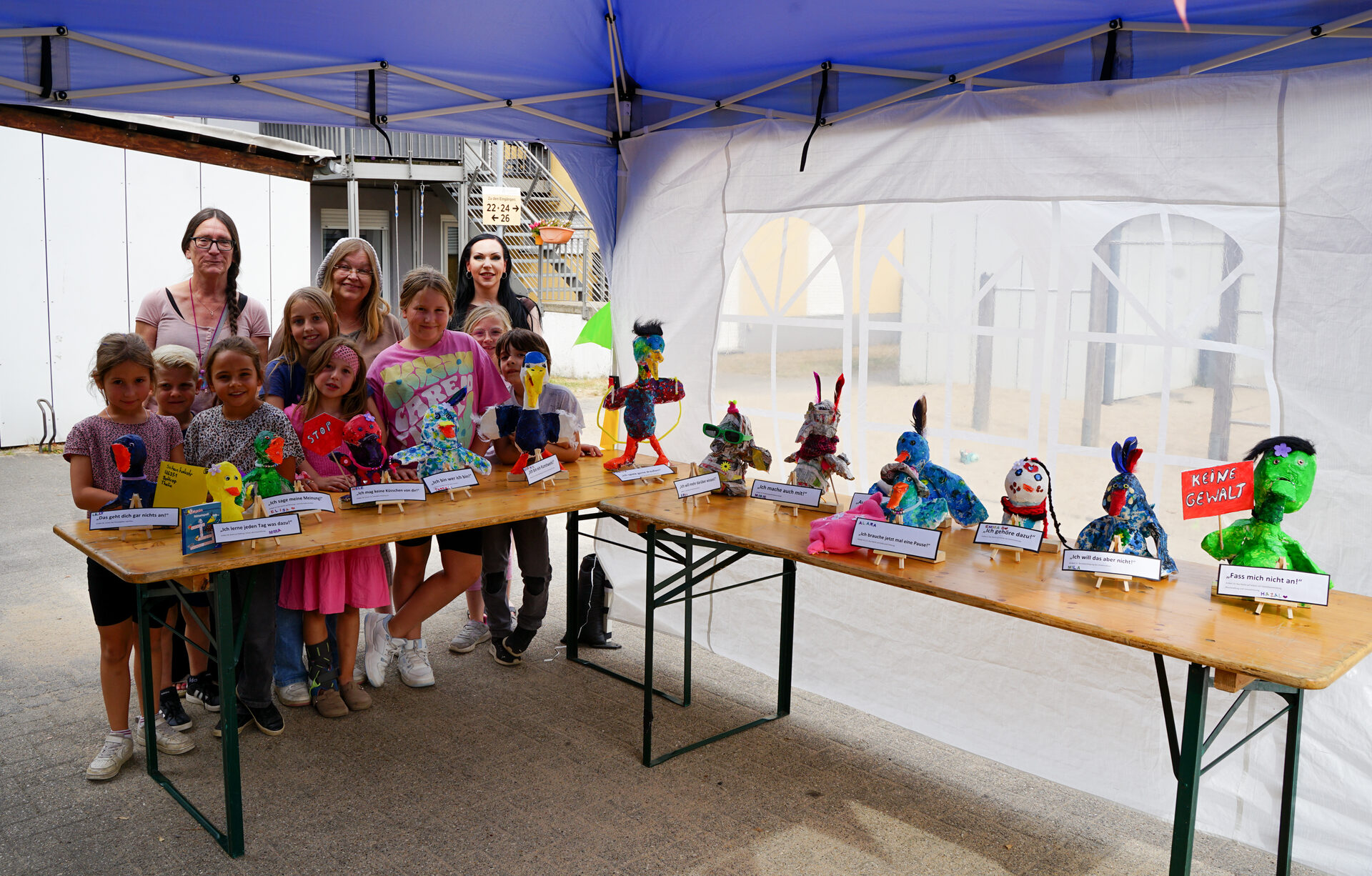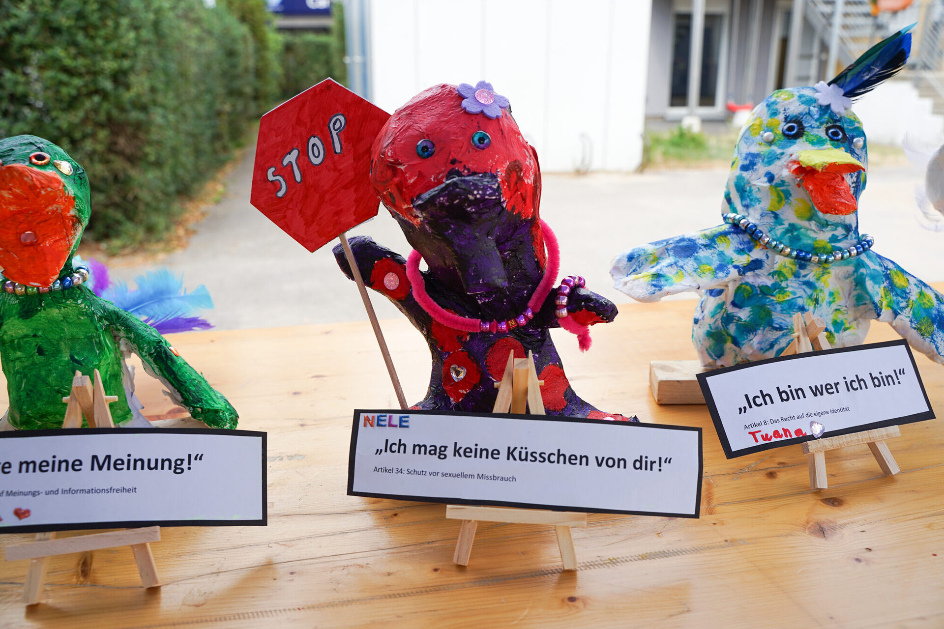 Aussagen wie „Das geht dich gar nichts an!“ oder „Ich bin ein Kunstwerk!“ spiegelten die Kinderrechte wider und unterstützten die Kinder dabei, ihre Rechte verstehen und darstellen zu können. Das „Recht auf Ruhe und Erholung“ wurde von Alara mithilfe eines Kissens dargestellt und Thalia fügte ihrer Skulptur zum „Recht auf Spiel und altersgemäße aktive Betätigung“ ein Springseil hinzu. Am 26. August fand die offizielle Ausstellung in der Villa Querbeet statt, bei der die Kinder stolz ihre Kunstwerke Verwandten, Bekannten und Freunden präsentierten.