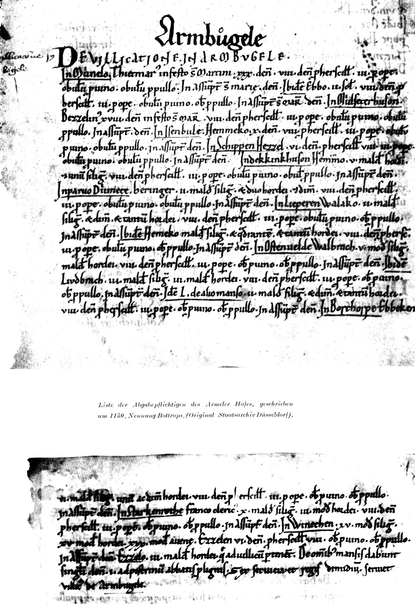 Mit der Nennung des Oberhofes Armbugila in den Güterverzeichnissen der Abtei Werden wird Bottroper Stadtgeschichte erstmals urkundlich fassbar. Das um 1150 geschriebene „Liber privilegiorum maior" hält fest, dass eine gewisse Thiadhilt „dem Kloster des Hl. Erlösers, das in Werden erbaut ist", ein Gebiet in Armbugila geschenkt habe. Dem möglicherweise am Donnerberg gelegenen Hof, der vermutlich schon vor 900 entstanden war, musste ein Ebbeken von "Borthorpe" Naturalabgaben (Weizen, Gerste) und - buchstäblich in kleiner Münze - eine Art Steuer für das Heer sowie andere Zahlungen für den Frondienst, für Wein und ein junges Huhn leisten.