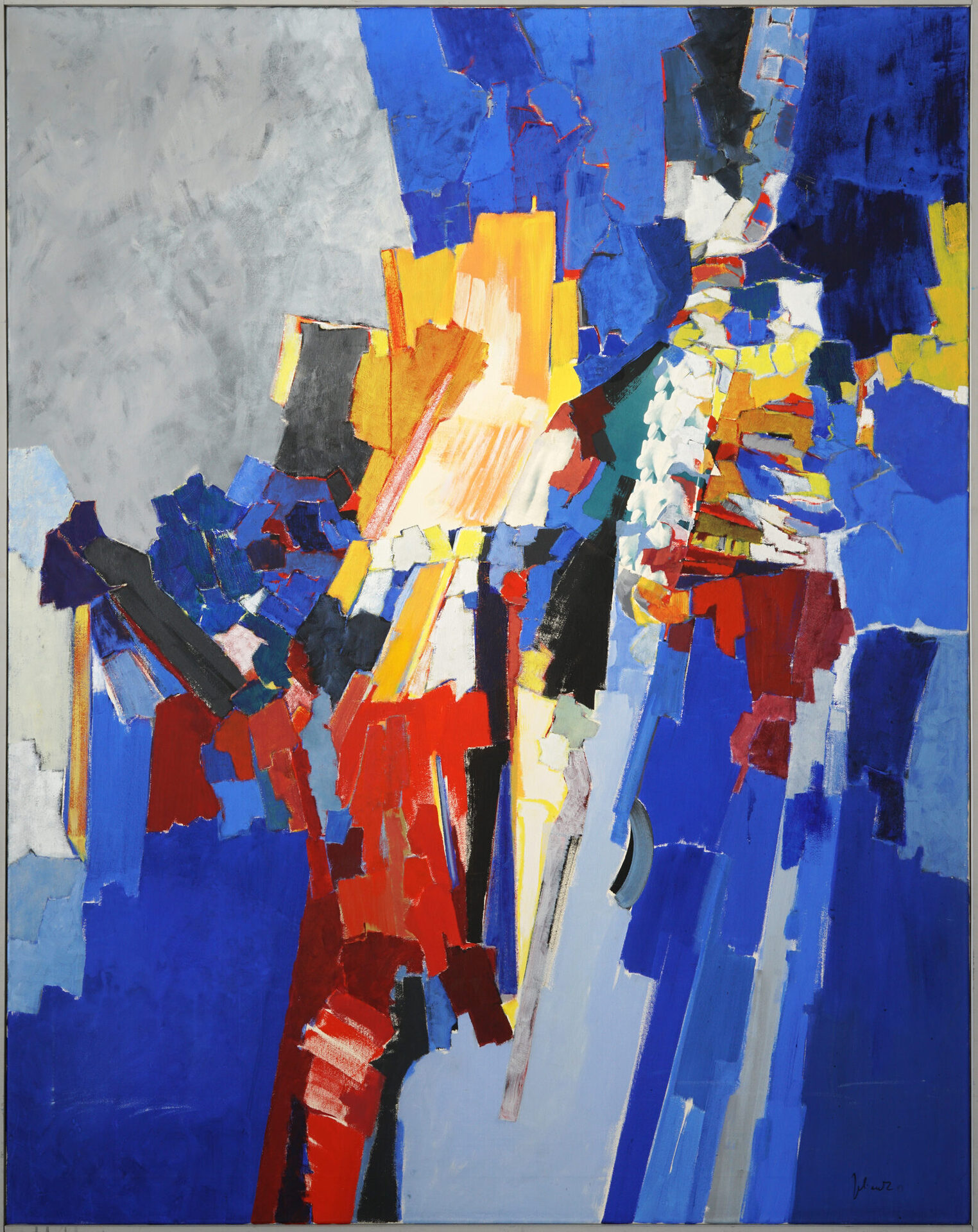 Die Collage ist ein altbekanntes Sujet in Jelineks Arbeiten. Das Collagenhafte entsteht jedoch nicht durch das Zusammenwirken malereifremder Materialien. Werner Jelinek hält sich an die Malerei selbst. Er kombiniert Farben in eng voneinander abgegrenzten Formgebilden. Unregelmäßig stoßen die Formengebilde aneinander, überlagern sich oder lassen die Farben – viele von ihnen in strahlenden Blautönen - in Schichtungen ihre Formen entwickeln.