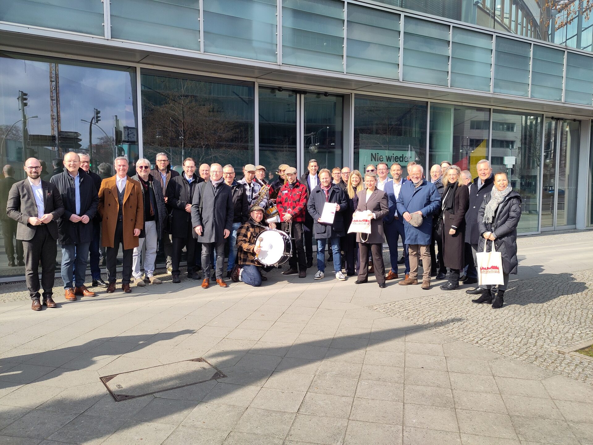 Das politische Berlin hat am Freitagmittag ein besonderes musikalisches Highlight erlebt. Vor dem Konrad-Adenauer- und dem Willy-Brandt-Haus spielten Drummer der Gruppe It’s live zwei kurze Konzerte. Die Band war Teil des Besuchs vom Aktionsbündnis „Für die Würde unserer Städte“. Darin haben sich finanzschwache Kommunen aus acht Bundesländern zusammengeschlossen. Deren Bürgermeisterinnen und Bürgermeister, Kämmerinnen und Kämmerer präsentierten vor den Parteizentralen ihre Forderungen für die Koalitionsverhandlungen. Das passende Motto: „Wer die Musik bestellt, muss sie auch bezahlen“.