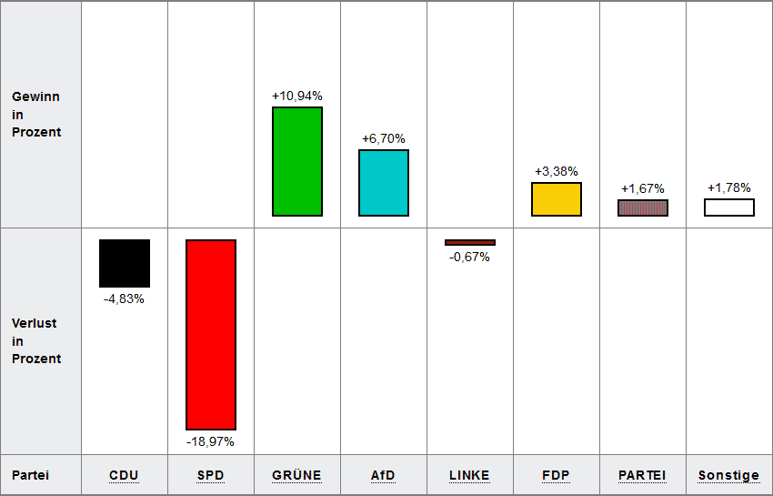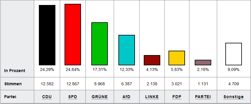 - SPD (12.867 Stimmen, 24,84 Prozent, minus 18,97 Prozent zu 2014)