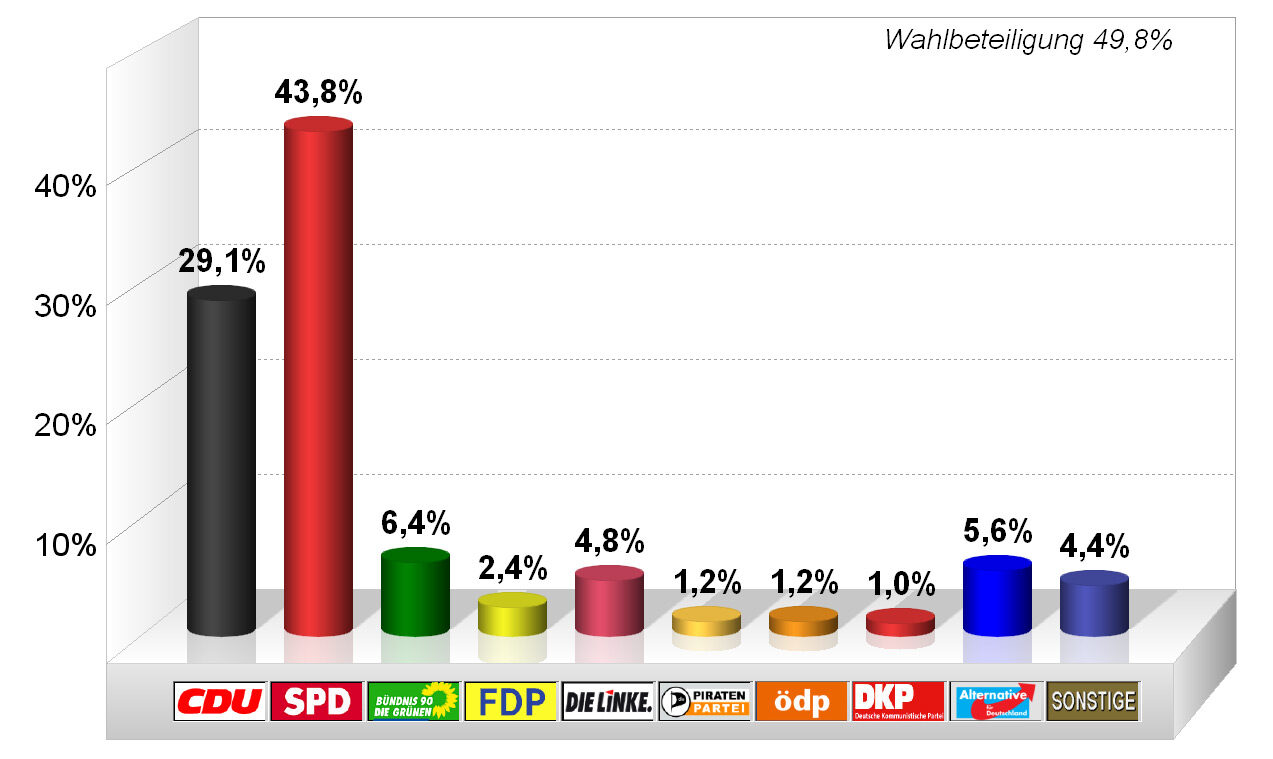 - SPD (19.250 Stimmen, 43,81 Prozent, plus 6,3 Prozent zu 2009),