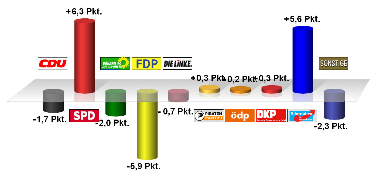 - CDU (12.793 Stimmen, 29,12 Prozent, minus 1,7 Prozent zu 2009),