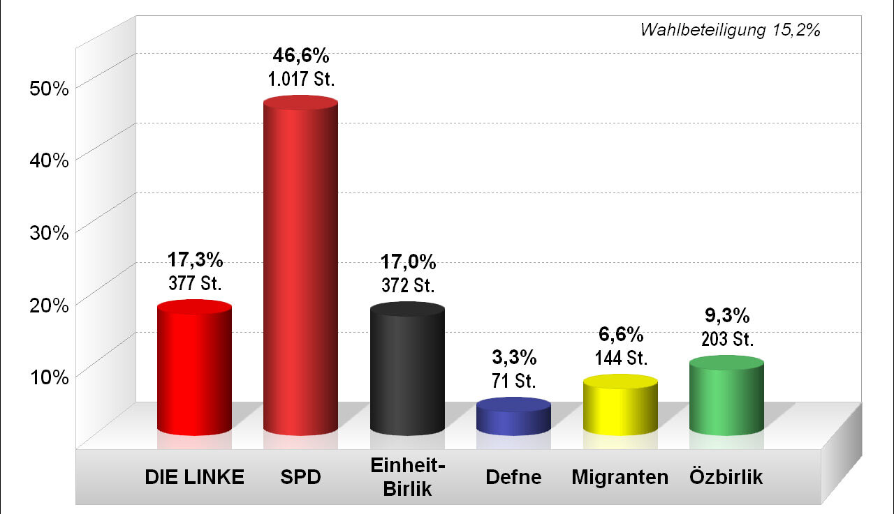 SPD (1.017 Stimmen, 46,6 Prozent, 5 Sitze: Seref Yarisli, Hajra Dorow, Mesut Özdemir, Parthena Koutouxiadou und Sami Helaili, Liste bei der Wahl in 2010 nicht vertreten),
