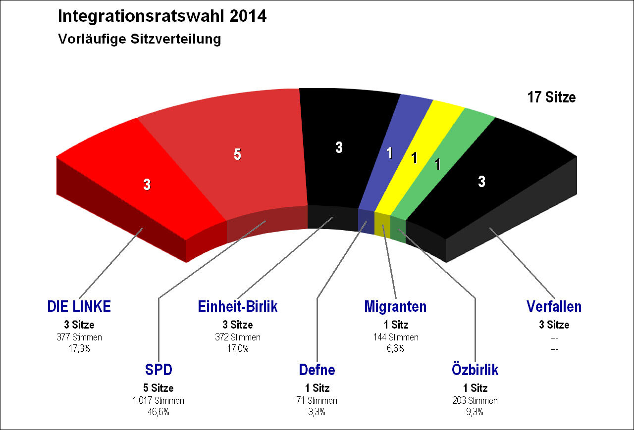 Die Stimmen und Prozente verteilen sich nach der Wahl der 14 direkt gewählten Integrationsratsmitglieder auf folgende Gruppierungen mit der angegebenen Sitzverteilung: