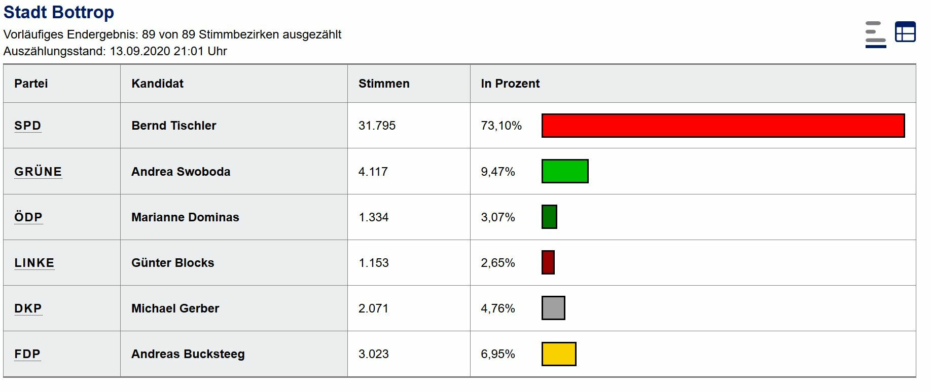 Das erste vorläufige Endergebnis am heutigen Wahltag liegt vor: Bernd Tischler ist zum dritten Mal zum Oberbürgermeister der Stadt Bottrop gewählt worden. Tischler, der wieder für seine Partei, die SPD, antrat bekam 31.795 Stimmen, was 73,10 Prozent der 44.607 insgesamt abgegebenen Stimmen entspricht. Bei der vorangegangenen OB-Wahl am 25. Mai 2014 bekam Tischler 29.660 Stimmen (66,1 Prozent).