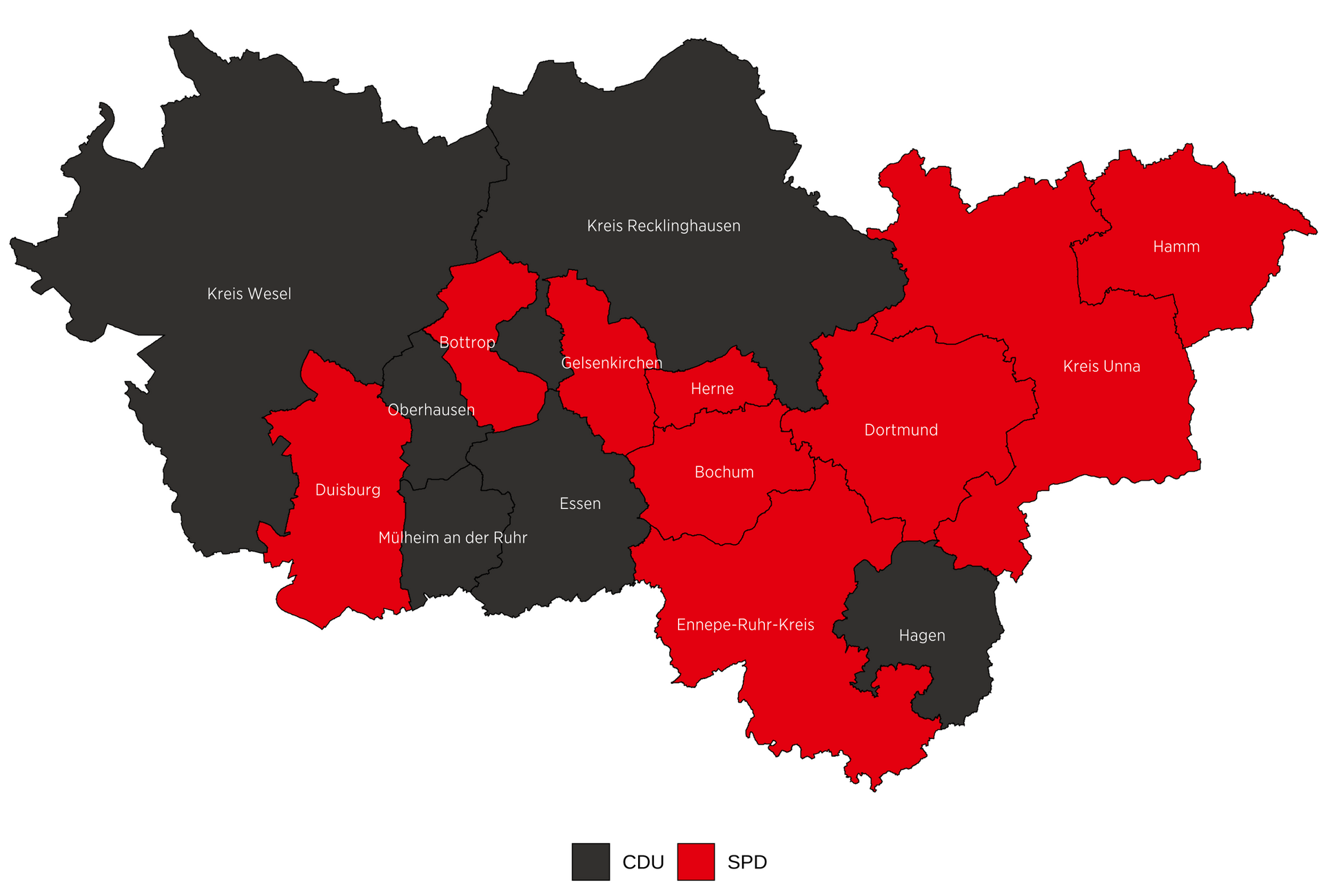 Die SPD ist im Ruhrgebiet in Hamm (46,2 Prozent) und Herne (37 Prozent). In Hamm verbesserte sie im Vergleich zur Kommunalwahl 2020 ihr Ergebnis um 9,1 Prozent. Verbesserungen gab es auch in Mülheim an der Ruhr (+ 4,2 Prozent) und in Duisburg (+ 1,8 Prozent). Verloren hat die SPD in Bottrop (- 8,6 Prozent), Herne (- 7,1 Prozent), Oberhausen und Hagen (- 5,6 Prozent).