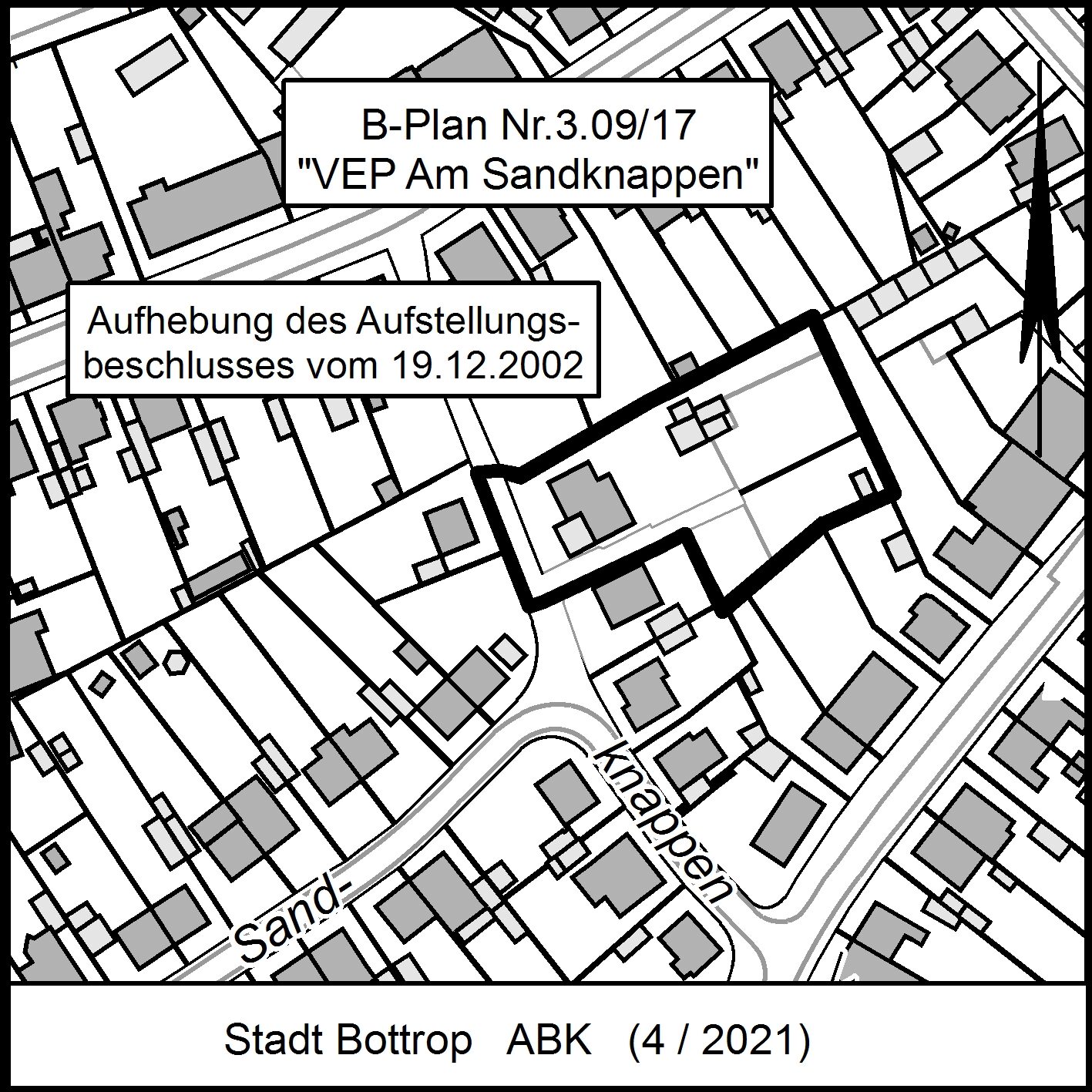 - Der vom Rat der Stadt in seiner Sitzung am 19.12.2002 gefasste Beschluss, für den Bereich der Flurstücke 112, 178 und 179 in Flur 64 der Gemarkung Bottrop den Bebauungsplan Nr. 3.09/17 Vorhaben- und Erschließungsplan „Am Sandknappen“ aufzustellen, wird aufgehoben.