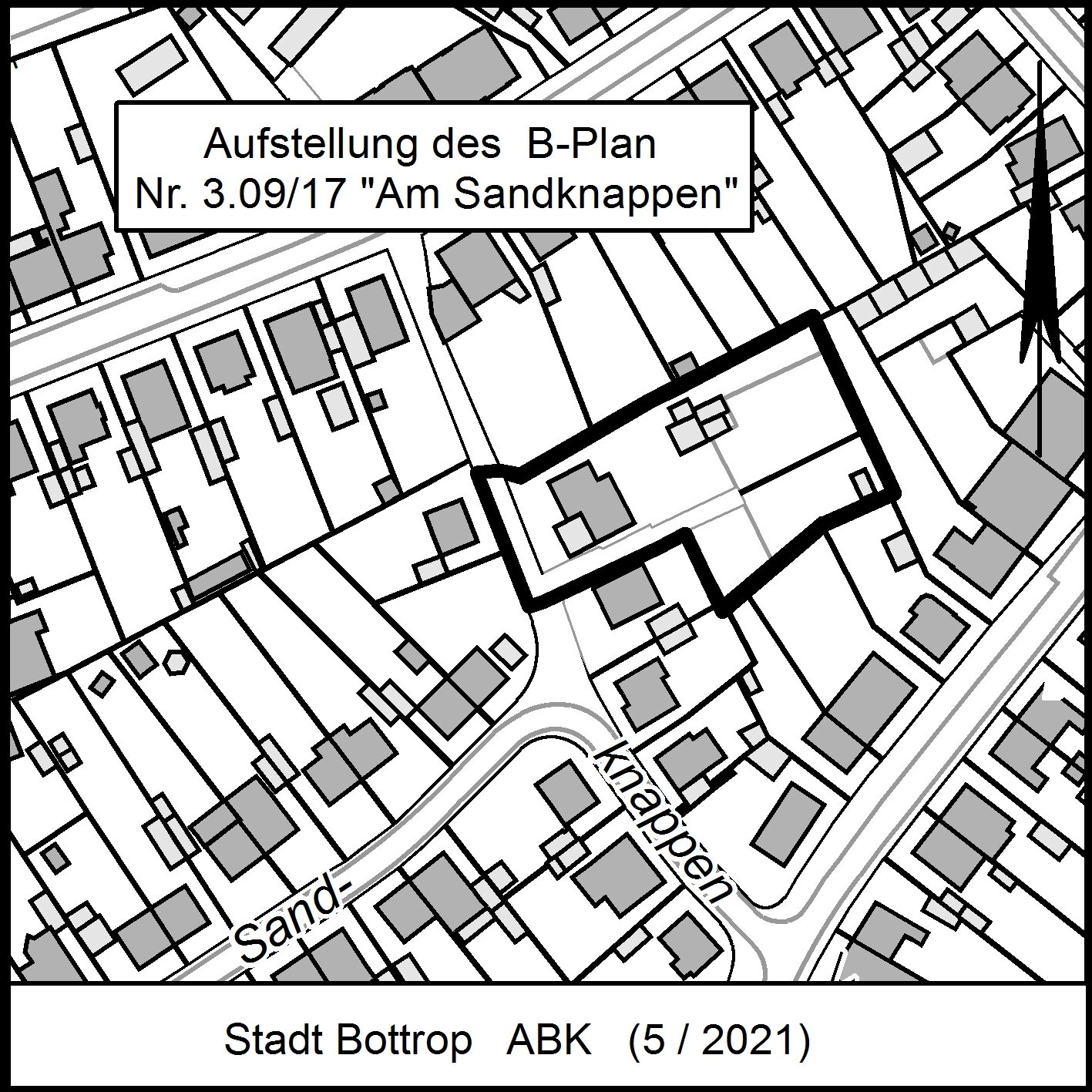 - Für den Bereich der Flurstücke 112, 178 und 179 in Flur 64 der Gemarkung Bottrop ist der Bebauungsplan Nr. 3.09/17 „Am Sandknappen“ als Bebauungsplan der Innenentwicklung im beschleunigten Verfahren gemäß § 13a BauGB ohne Durchführung einer Umweltprüfung nach § 2 (4) BauGB aufzustellen.