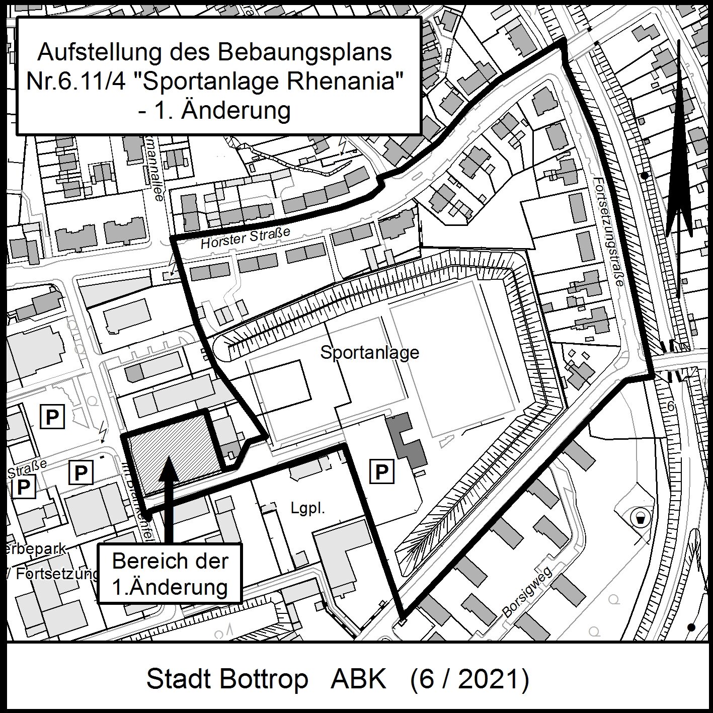 - Für eine Teilfläche des Flurstücks 348 in Flur 99 der Gemarkung Bottrop ist der Bebauungsplan Nr. 6.11/4 „Sportanlage Rhenania“ – 1. Änderung als Bebauungsplan der Innenentwicklung im beschleunigten Verfahren gemäß § 13a BauGB ohne Durchführung einer Umweltprüfung nach § 2 (4) BauGB aufzustellen.