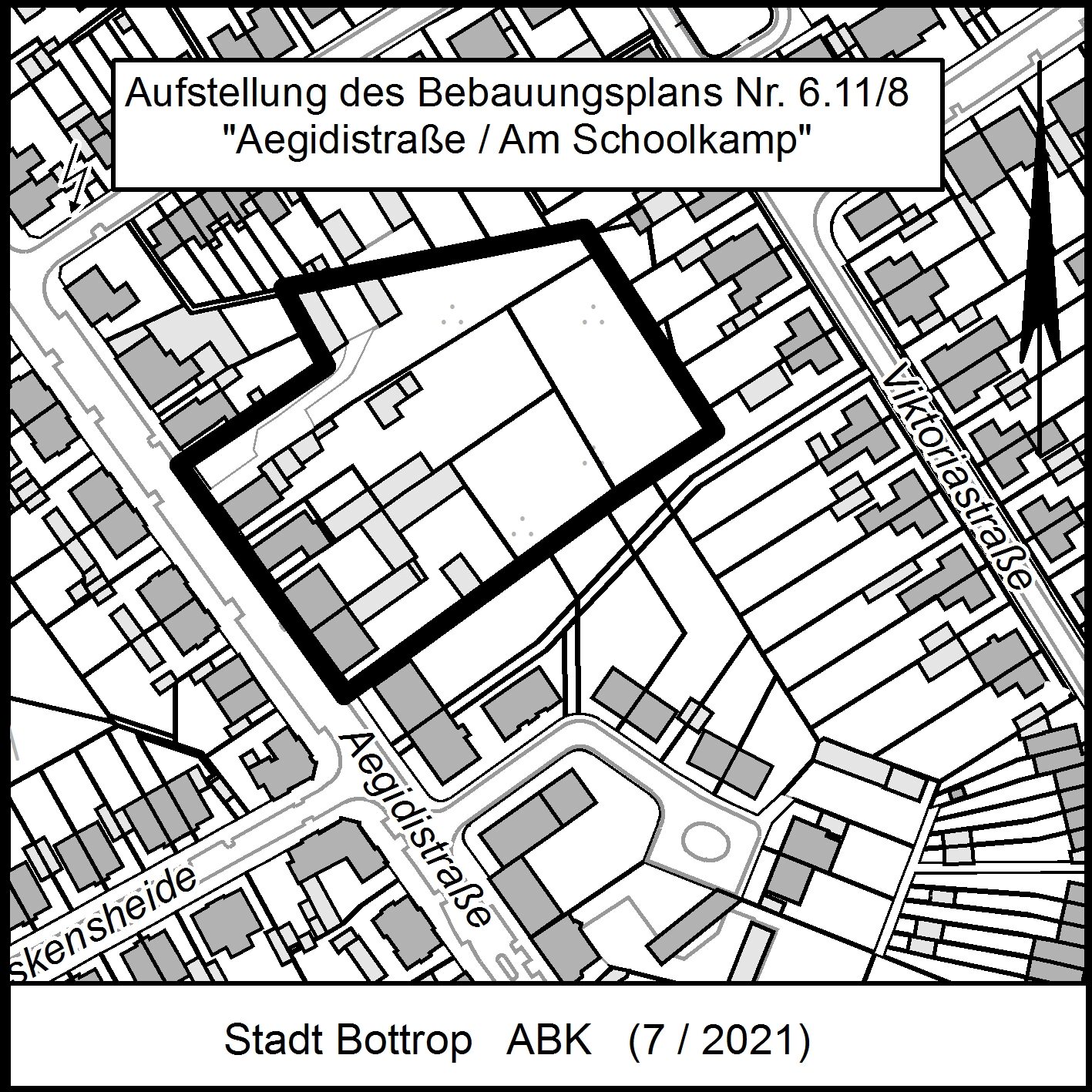 - Für einen Bereich angrenzend an die Aegidistraße (Flurstücke 129, 131, 133, 137, 200, 201, 672 und 673 in Flur 93 der Gemarkung Bottrop) ist der Bebauungsplan Nr. 11/8 „Aegidistraße/Am Schoolkamp“ als Bebauungsplan der Innenentwicklung im beschleunigten Verfahren gemäß § 13a BauGB ohne Durchführung einer Umweltprüfung nach § 2 (4) BauGB aufzustellen.