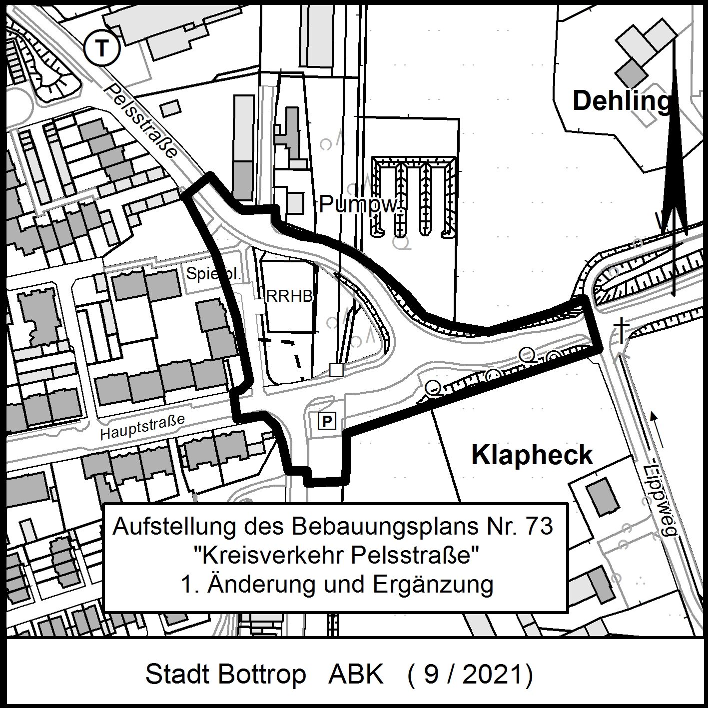 - Für den Kreuzungsbereich der Haupt- und Pelsstraße mit der Feldhausener Straße (Flurstücke 130 bis 133, 135, 138, 139, 141 und teils 140 in Flur 16 der Gemarkung Kirchhellen; Flurstücke 1517 bis 1520, 1522, 1524, 1544, 1546, 1553, 1554, 1556, 1557 und teils 1540 sowie 1547 in Flur 18 der Gemarkung Kirchhellen; Flurstücke 91, 419, 504, 586, 855, 859 bis 861 und teils 419 sowie 738 in Flur 63 der Gemarkung Kirchhellen) ist der Bebauungsplan 73 „Kreisverkehr Pelsstraße“ – 1. Änderung und Ergänzung aufzustellen.