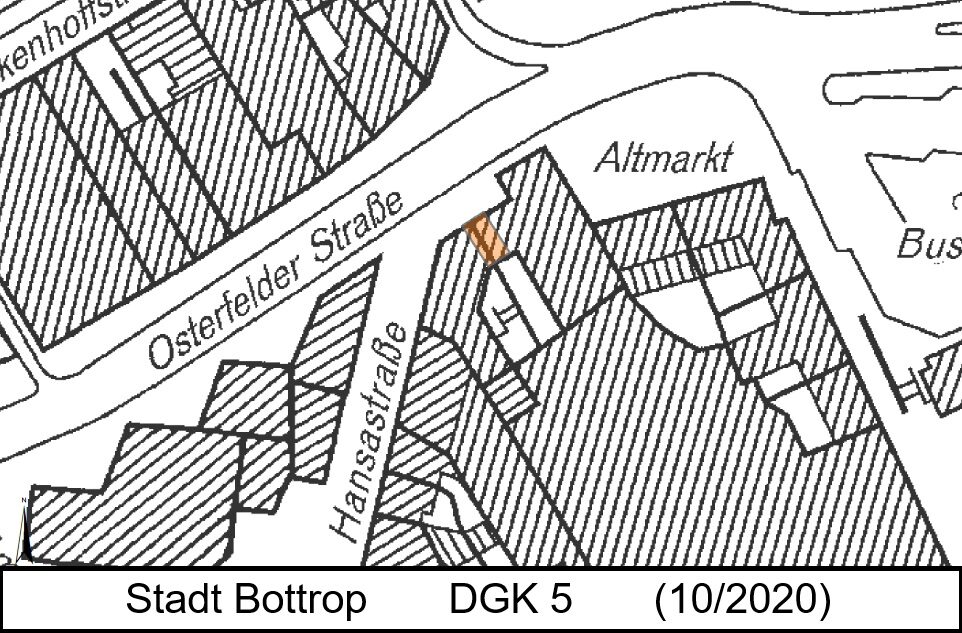 Ein Teilbereich der öffentlichen Verkehrsfläche am Zugang zum Hansazentrum, Altmarkt 6 (Flurstücke 190 und 191 in der Flur 60 der Gemarkung Bottrop), soll eingezogen werden.