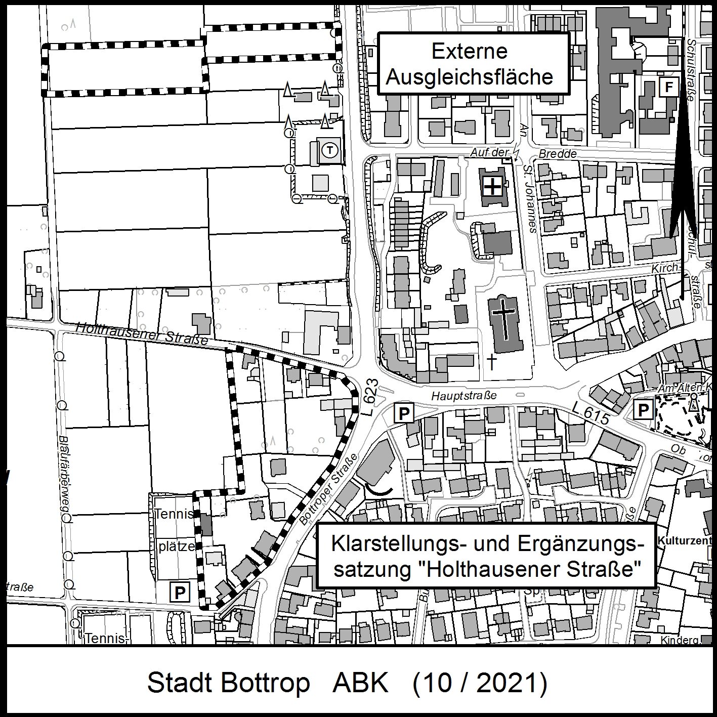 Die Satzung setzt den naturschutzrechtlichen Ausgleich teilweise auf Flächen außerhalb des Geltungsbereichs fest. Auf der externen Ausgleichsfläche Gemarkung Kirchhellen, Flur 61, Flurstücke 63 und 137 soll auf einer Fläche von 3.595 m² eine extensive Streuobstwiese angelegt werden. Die Lage dieser Fläche ist ebenfalls im Übersichtsplan dargestellt.