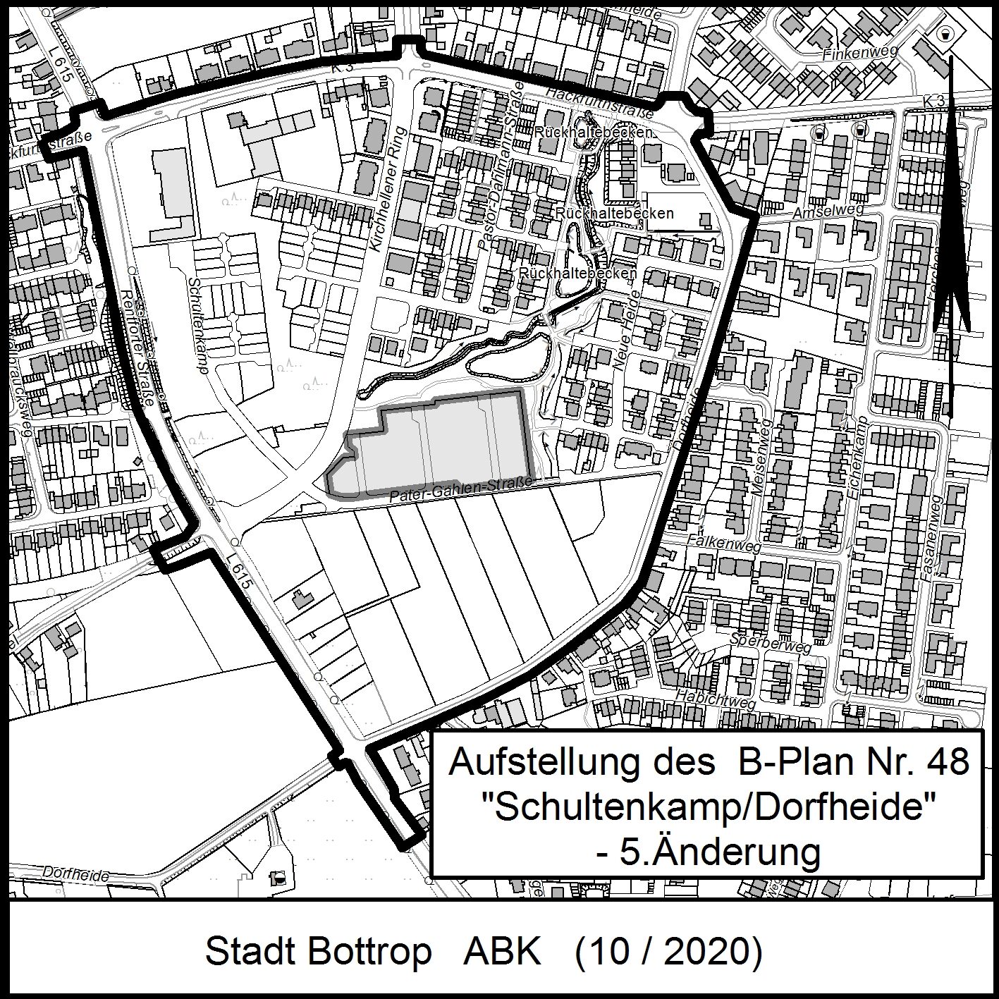 Der vom Rat der Stadt Bottrop als Satzung beschlossene Bebauungsplan Nr. 48 „Schultenkamp/Dorfheide“ – 5. Änderung wird hiermit gemäß § 10 (3) BauGB und § 7 Gemeindeordnung NRW sowie § 29 Hauptsatzung der Stadt Bottrop – in ihrer jeweils gültigen Fassung – öffentlich bekannt gemacht. Der räumliche Geltungsbereich ist im folgenden Übersichtsplan gekennzeichnet.
