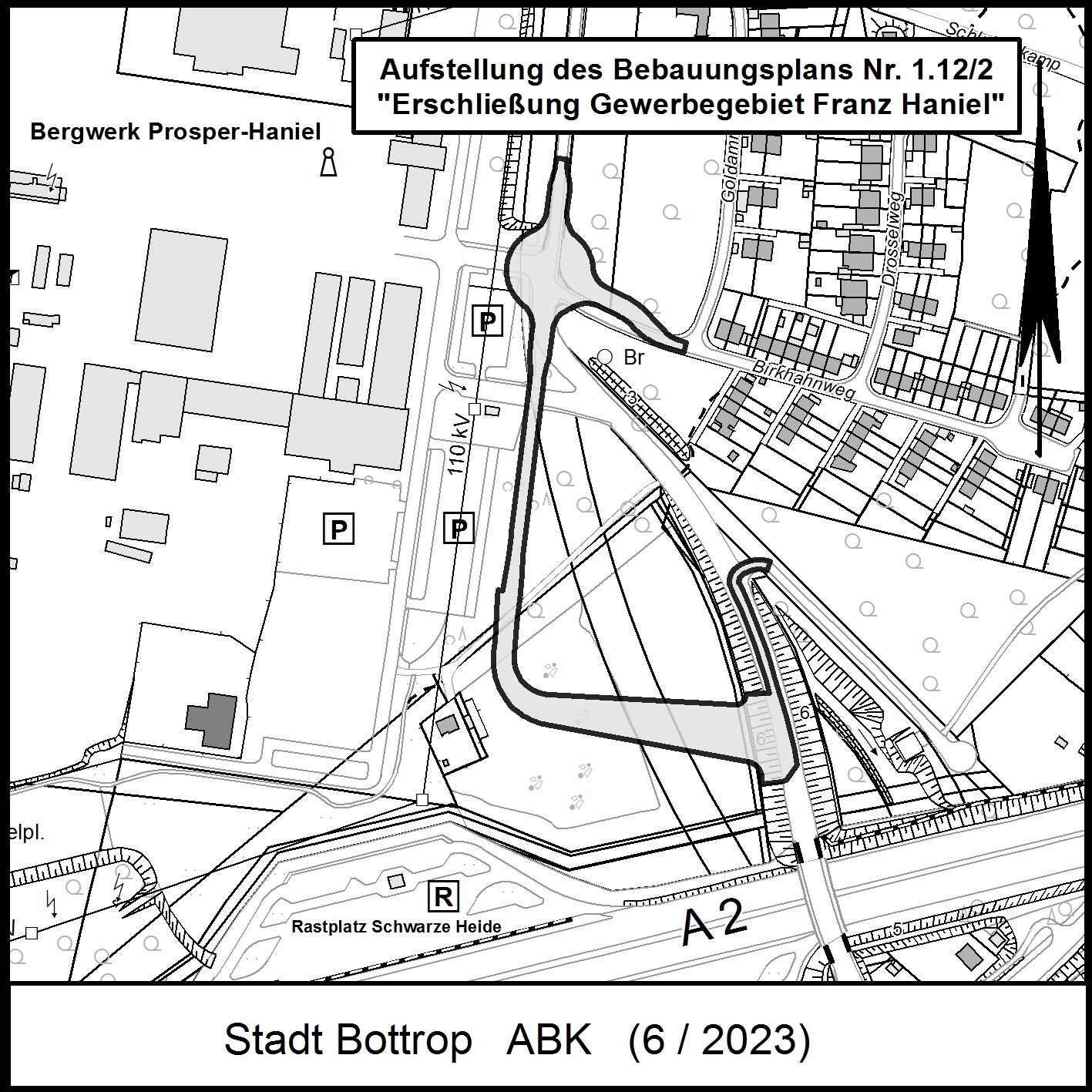 - Für Teile der Flurstücke 328, 337, 339, 327, 425, 4, 312, 102, 487 und 296 der Flur 146 sowie für Teile der Flurstücke 21, 23, 14 und 6 in Flur 167 der Gemarkung Bottrop ist der Bebauungsplan Nr. 1.12/2 „Erschließung Gewerbegebiet Franz Haniel“ aufzustellen.