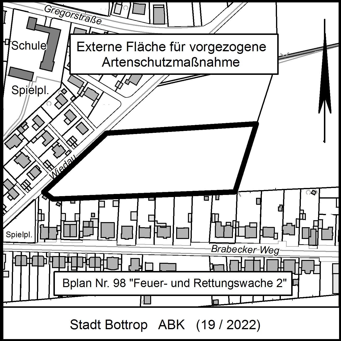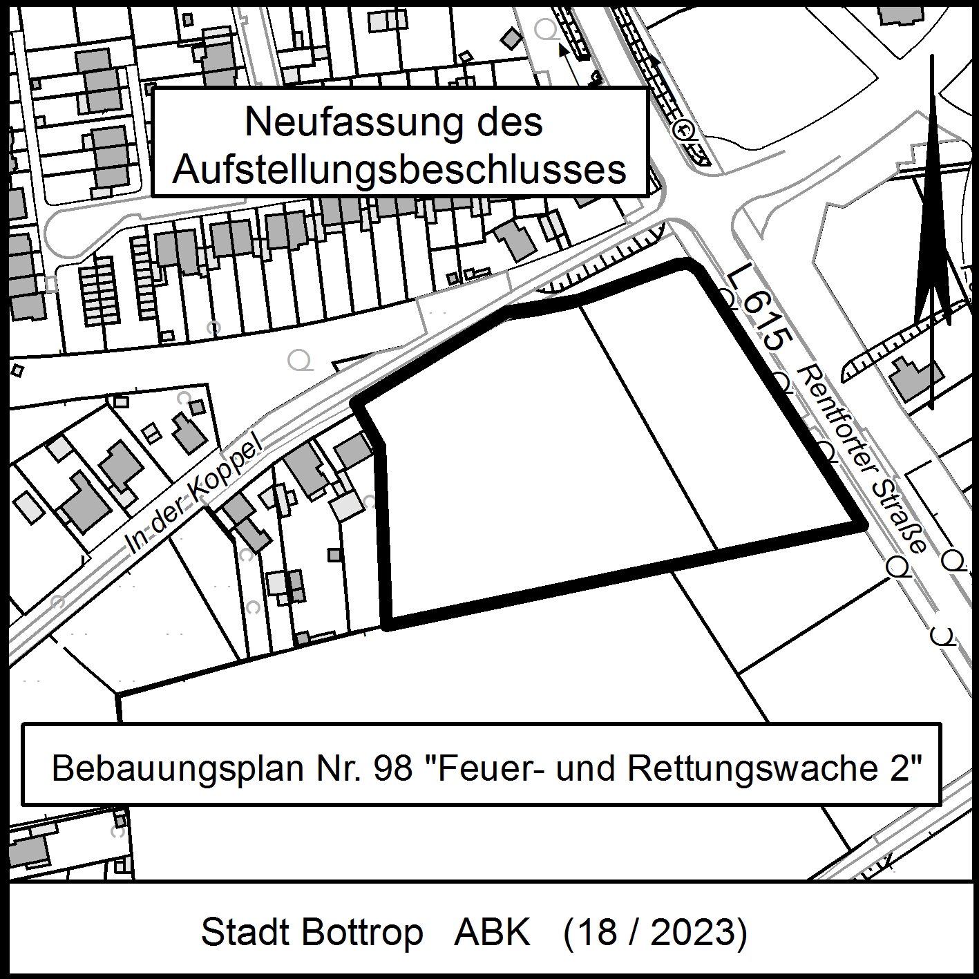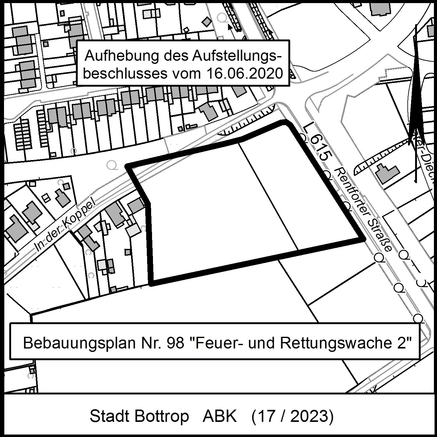 - Der vom Ausschuss für Stadtplanung und Umweltschutz in seiner Sitzung am 16.06.2020 gefasste Beschluss, für Flächen westlich der Rentforter Straße und südlich der Straße In der Koppel (Flurstücke 471, 472 und 473 in Flur 75 der Gemarkung Kirchhellen) den Bebauungsplan Nr. 98 „Feuer- und Rettungswache 2“ aufzustellen, wird aufgehoben.