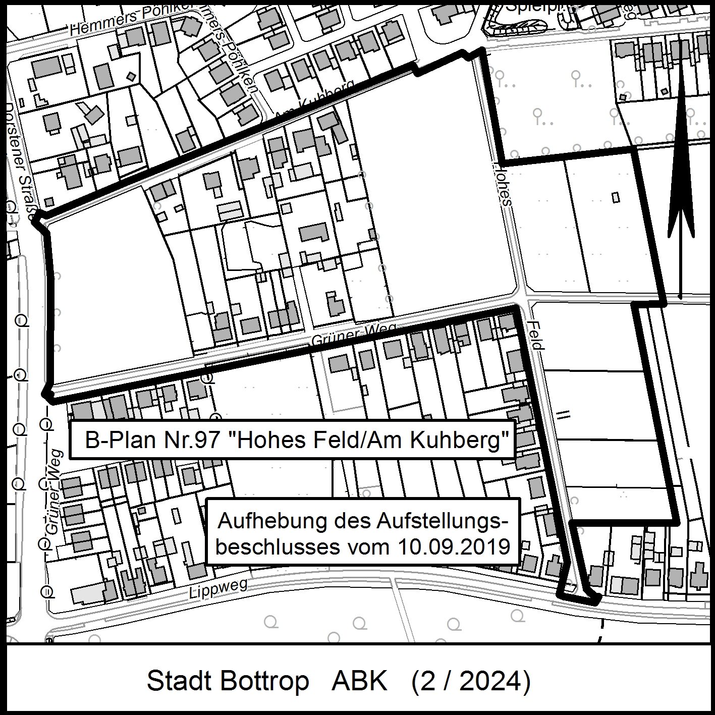 - Der vom Ausschuss für Stadtplanung und Umweltschutz in seiner Sitzung am 10.09.2019 gefasste Beschluss, für Flächen zwischen Dorstener Straße, Am Kuhberg, Hohes Feld und Grüner Weg sowie für Flächen östlich der Straße Hohes Feld den Bebauungsplan Nr. 97 „Hohes Feld / Am Kuhberg“ aufzustellen, wird aufgehoben.