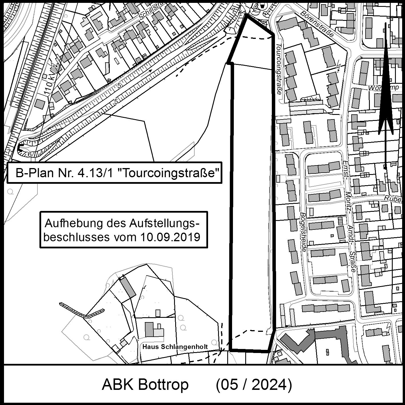 - Der vom Ausschuss für Stadtplanung und Umweltschutz in seiner Sitzung am 10.09.2019 gefasste Beschluss, westlich der Tourcoingstraße, für den Bereich des Flurstückes 336 sowie für einen Streifen des Flurstückes 327 den Bebauungsplan Nr. 4.13/1 „Tourcoingstraße“ aufzustellen, wird aufgehoben.