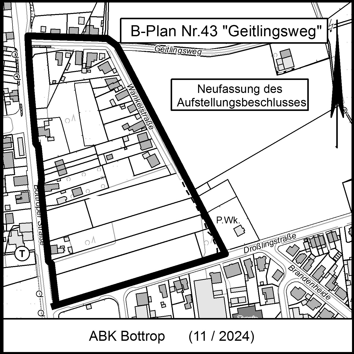 - Für die Flächen zwischen Bottroper Straße, Wankelstraße, Droßlingstraße und Geitlingsweg ist der Bebauungsplan Nr. 43 „Bottroper Straße/Droßlingstraße“ aufzustellen.