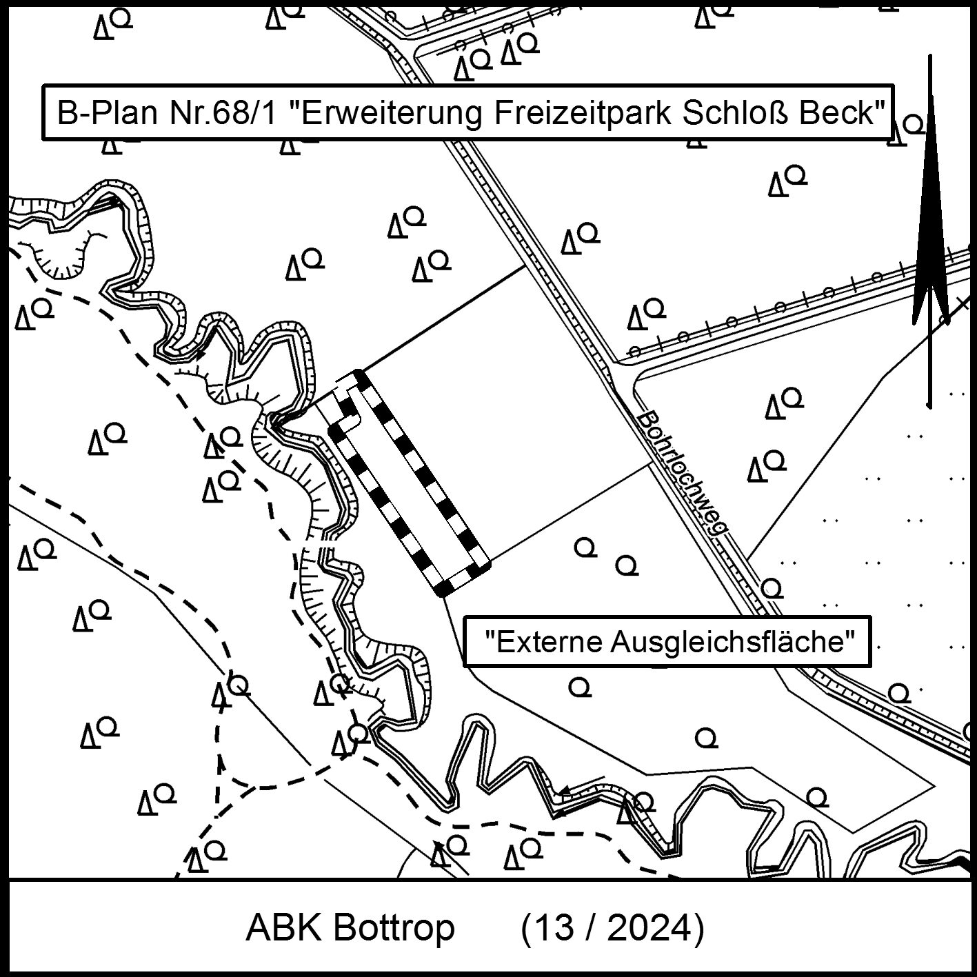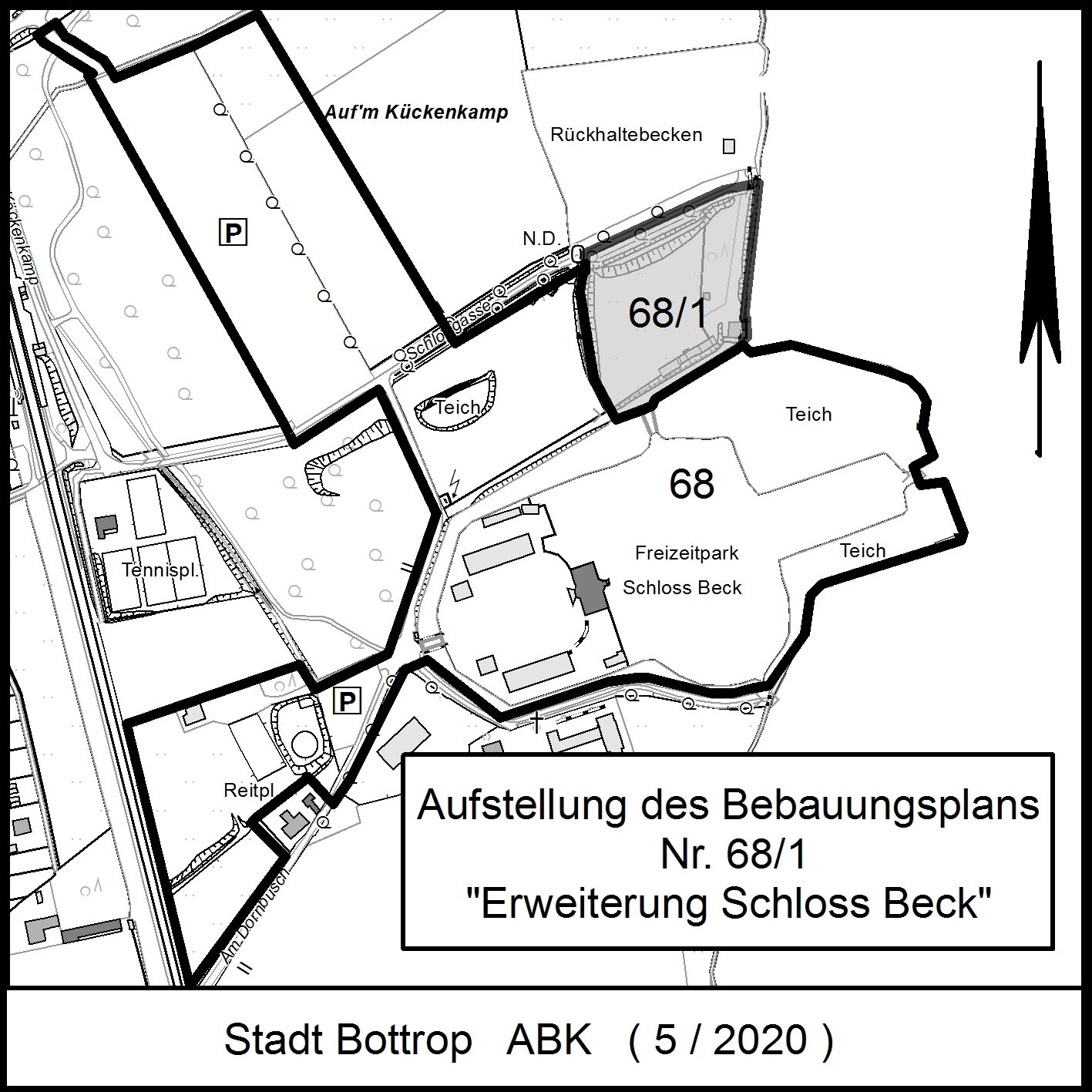 Der vom Rat der Stadt Bottrop als Satzung beschlossene Bebauungsplan Nr. 68/1 „Erweiterung Freizeitpark Schloß Beck“ wird hiermit gemäß § 10 (3) BauGB und § 7 Gemeindeordnung NRW sowie § 29 Hauptsatzung der Stadt Bottrop – in ihrer jeweils gültigen Fassung – öffentlich bekannt gemacht. Der räumliche Geltungsbereich ist im folgenden Übersichtsplan gekennzeichnet.