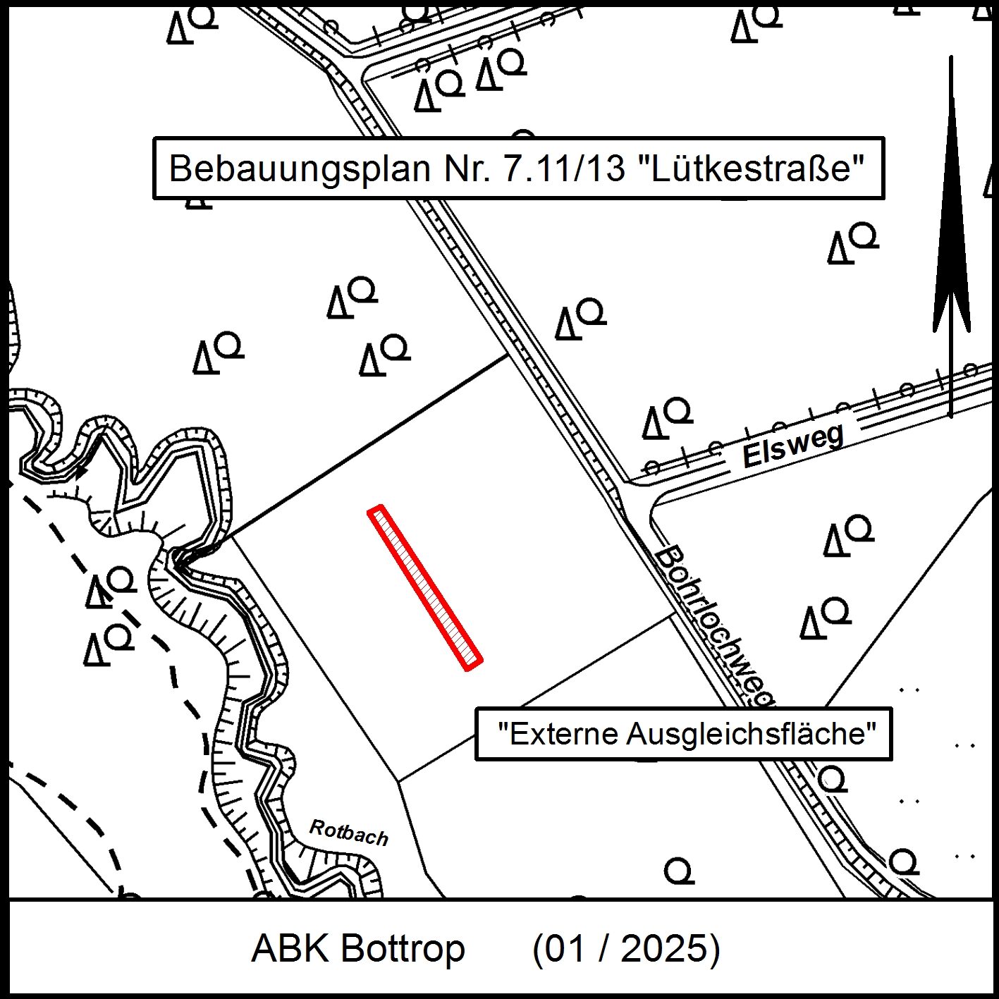 Der naturschutzrechtliche Ausgleich kann nicht vollständig innerhalb des Plangebiets ausgeglichen werden. Das verbleibende Kompensationsdefizit in Höhe von 3.576 Wertpunkten wird über ein externes Ökokonto ausgeglichen. Die auf einer 397 m² großen Teilfläche des Flurstücks 21 in Flur 29 der Gemarkung Kirchhellen gesicherten Ökopunkte beinhalten die Umwandlung einer neophytenreichen Ruderalflur in extensives Grünland. Die 397 m² große Teilfläche des Flurstücks 21 in Flur 29 der Gemarkung Kirchhellen ist im folgenden Übersichtsplan gekennzeichnet: