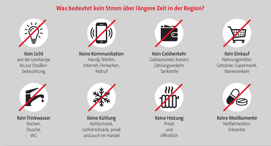 Stromausfall ist eine große Einschränkung unseres täglichen Lebens, umso mehr, je länger er dauert. Kein Strom zu haben bedeutet: Kein Licht, kein Telefon und damit kein Notruf, kein Fernsehen, keine funktionierende Kasse im Supermarkt, kein Geldautomat, keine Tankstelle, kein Trinkwasser, kein Kühlschrank, keine Heizung und keine Medikamente.