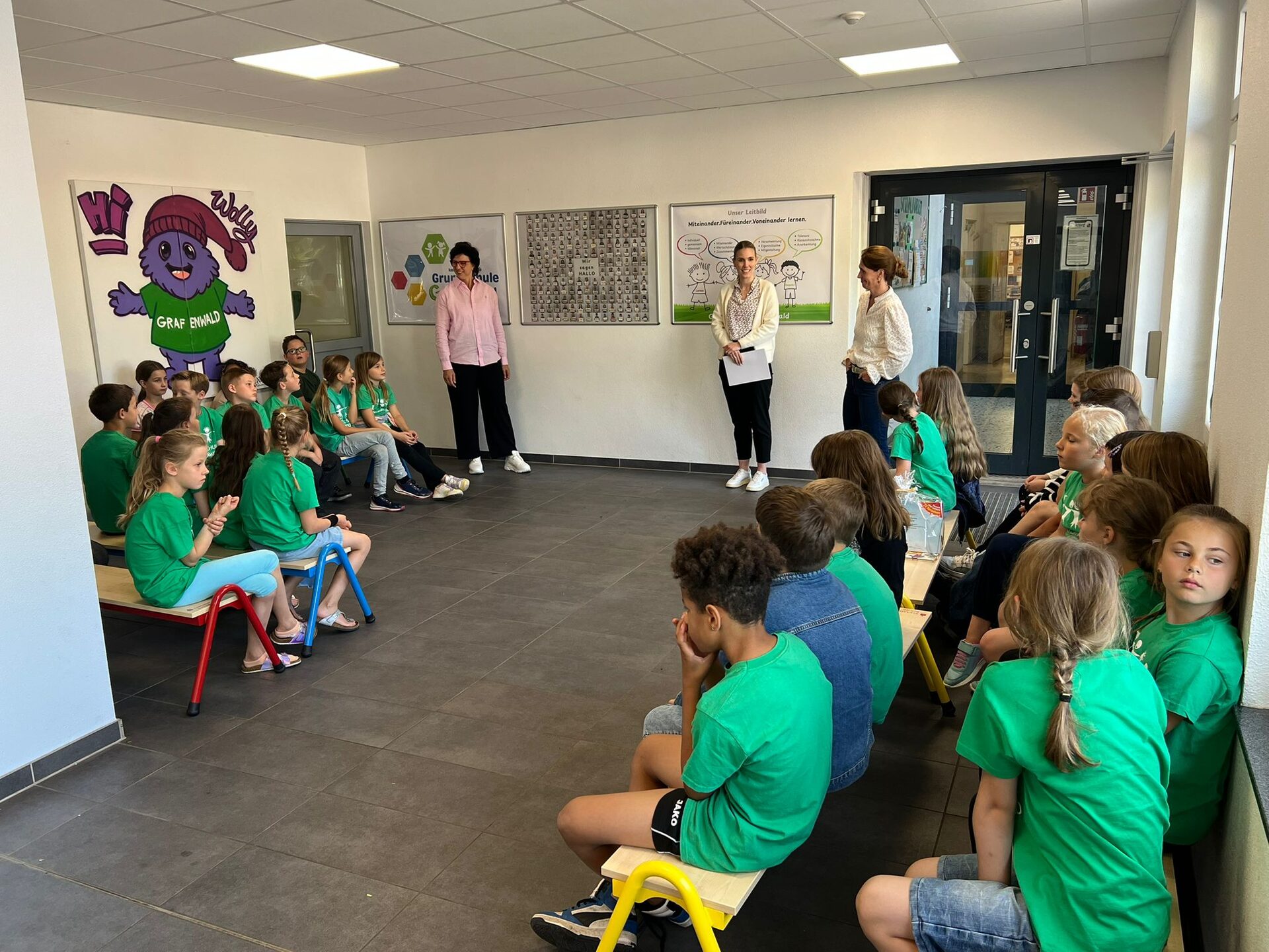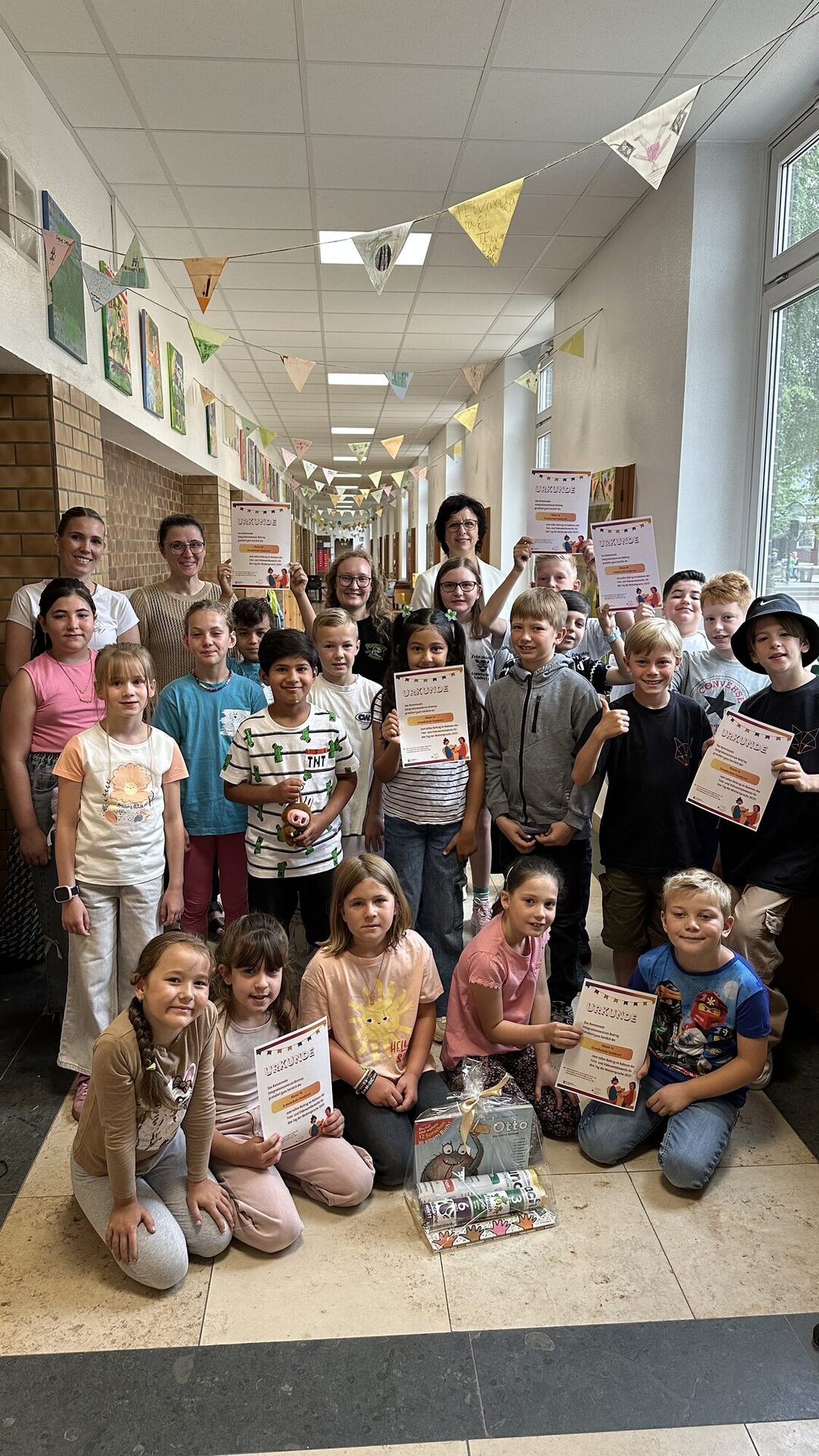 Zahlreiche Beiträge aus verschiedenen Einrichtungen zeigten auf beeindruckende Weise, wie vielfältig und lebendig Sprache in Bottrop gelebt wird. An der Marienschule gestalteten die DaZ-Kinder (Deutsch als Zielsprache) gemeinsam mit ihrer Lehrerin Frau Jandewerth ein digitales E-Book in verschiedenen Sprachen. Die Sekundarschule reichte ein kreatives Video ein, in dem sich Schülerinnen und Schüler der Jahrgangsstufe 7 in verschiedenen Sprachen vorstellten. Begleitet wurde das Projekt von Frau Kernspecht und Herrn Casas Cartagena. An der Grundschule Grafenwald beteiligten sich rund 200 Schülerinnen und Schüler. Unter der Leitung von Schulleiterin Frau Fischer und Schulsozialarbeiterin Frau Eickholt entstand eine beeindruckende Collage, die inzwischen als großes Poster den Eingangsbereich der Schule ziert. Die Flure der Grundschule Vonderort ziert nun eine circa 70 Meter lange Girlande mit etwa 200 Wimpeln, gebastelt von den Schülerinnen und Schülern. Unterstützt wurden sie dabei von der Schulleiterin Frau Konrads und der Schulsozialarbeiterin Frau Eickholt. Die DRK-Gruppe „Spielen und Sprechen“ hat mit Frau Smolny ein fröhliches Video unter dem Motto „Lachen ist in jeder Sprache gleich“ produziert. Die Kita St. Cyriakus-Mitte hat eine Collage von ihren Sprachen und mehrsprachigen Materialien gemacht, die Kita St. Barbara hat mehrsprachige Videobotschaften geschickt und die Gregorschule hat gemeinsam mit Frau Kolligs ein kreatives Video mit mehrsprachigen Wünschen geschickt.