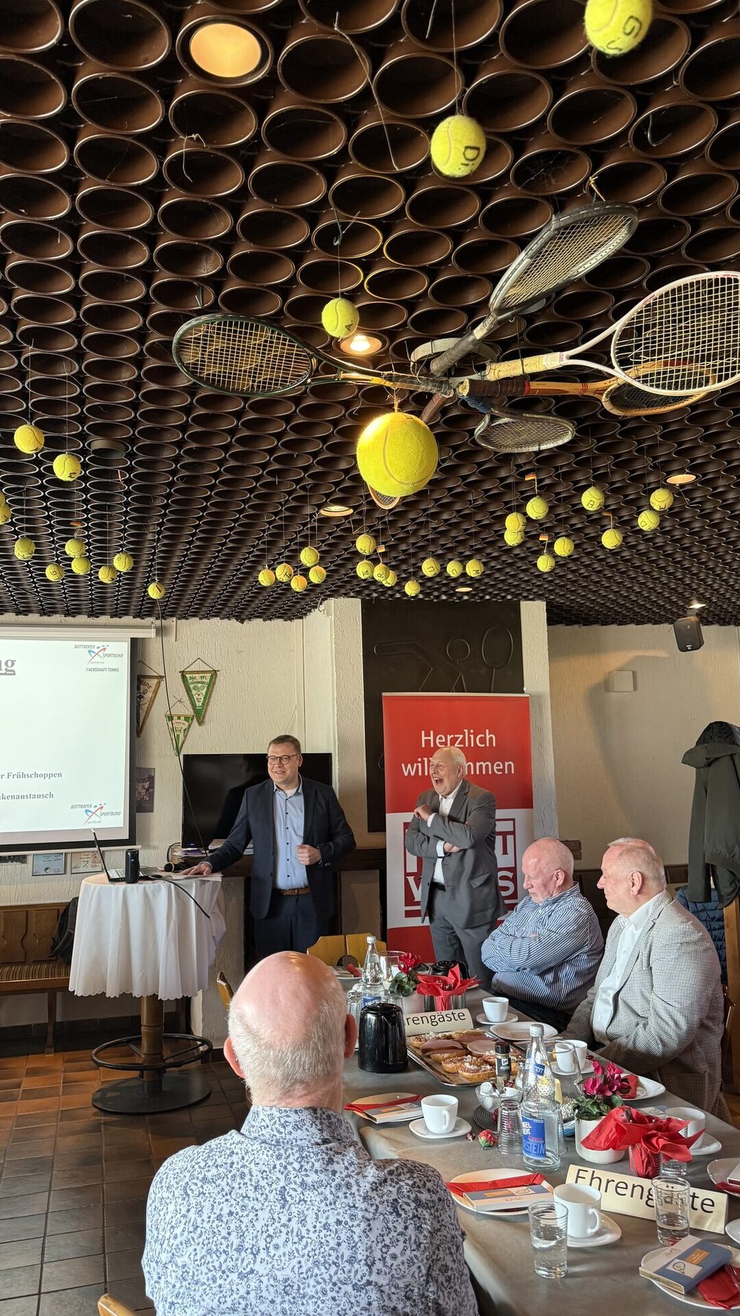 Als Ehrengast wurde mit Heinz Lehrmann auch der einstige Gründer des Vorstands-Frühschoppen über eine Liveschalte via Video zugeschaltet. Der mittlerweile 91-jährige langjährige Vorsitzende der Tennis-Fachschaft genießt seinen Lebensabend auf Lanzarote, erfreut sich bester Gesundheit und wusste die eine oder andere Anekdote zu berichten.