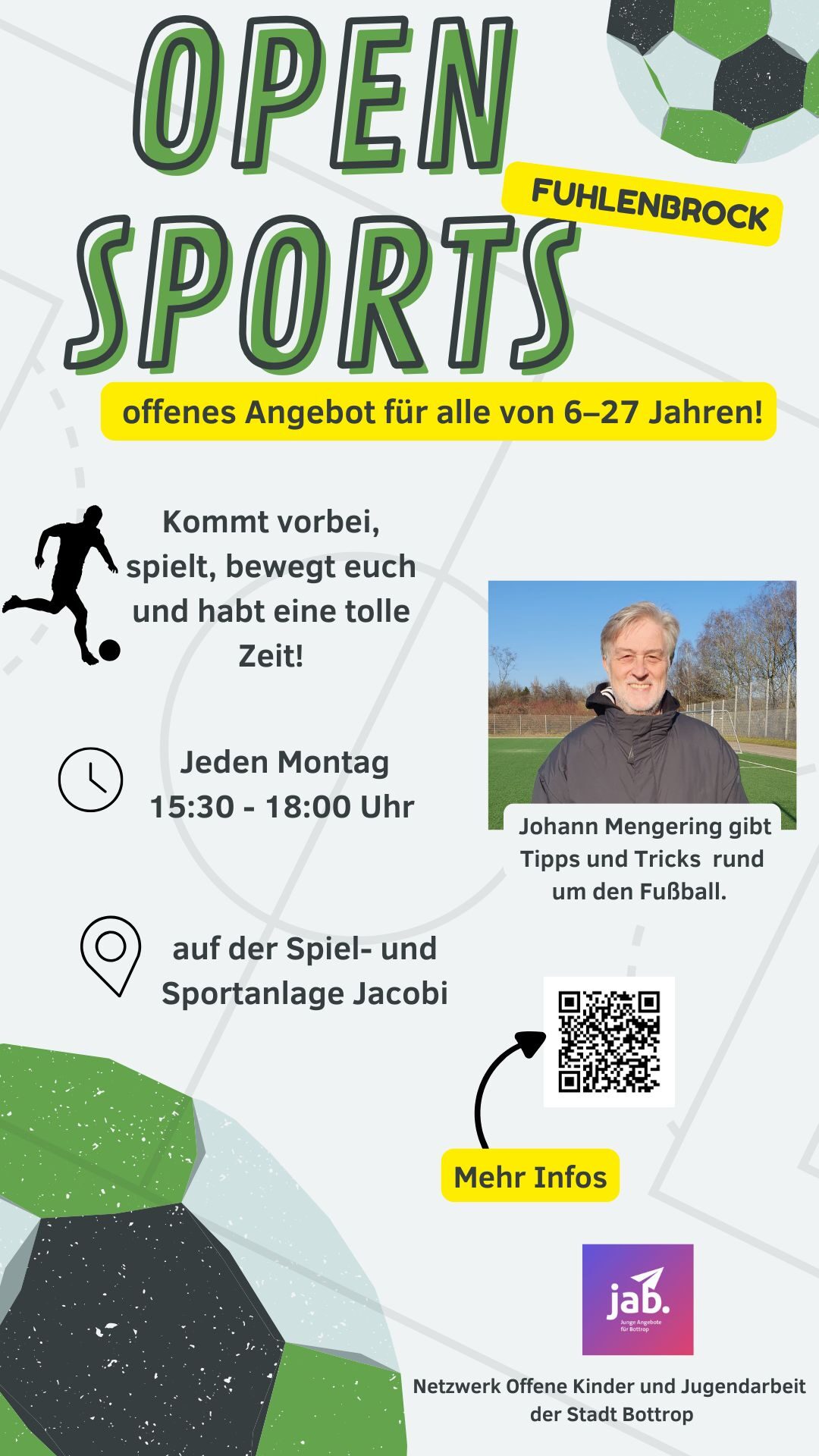 Von 15:30- 18:00 Uhr sind alle herzlich willkommen, die Lust auf Spiel, Bewegung und eine tolle Zeit haben! Johann Mengering ist immer vor Ort und heißt alle zwischen 6- 27 Jahren herzlich willkommen, um gemeinsam eine schöne Zeit zu erleben. Er hat nicht nur ein offenes Ohr für euch, sondern auch jede Menge Tricks und Tipps rund um den Fußball. Ob Anfänger oder nicht, MITEINANDER wird hier groß geschrieben. Viele Jugendliche sind schon da und spielen zusammen. Mit mehr als 25 Jahren Trainererfahrung hilft er euch zu verbessern und dabei Spaß zu haben.