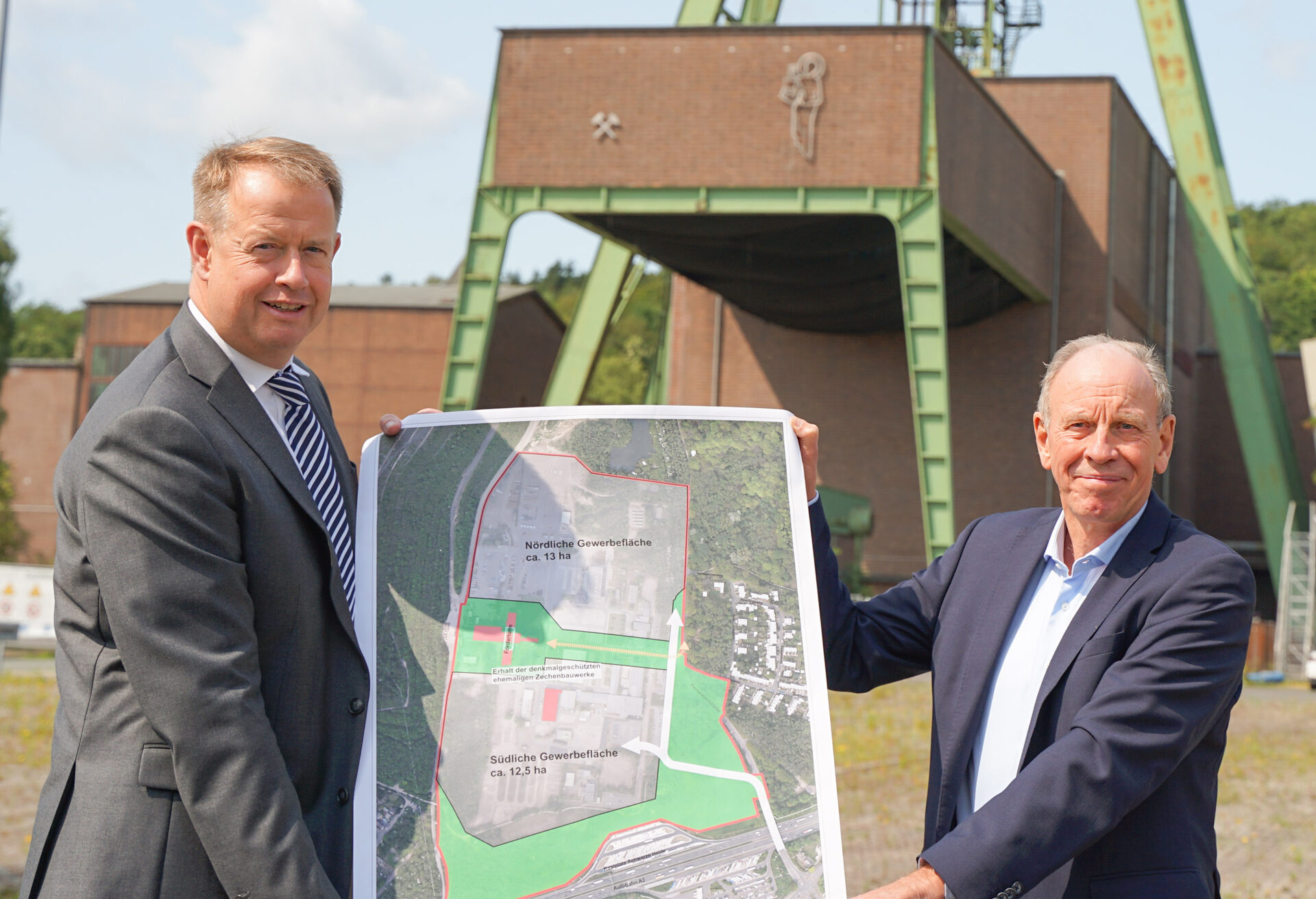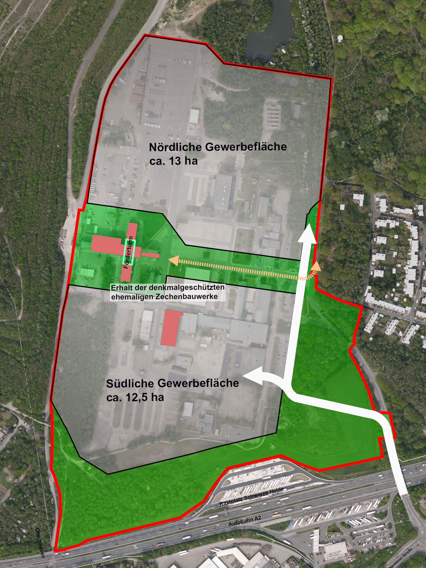Denkmalgeschützt ist auf dem Gelände der markante Förderturm. Er bleibt als prägendes Element bestehen und wird jetzt eingefasst in eine Grünflächenachse. Sie ist nicht nur das Verbindungsstück zur Halde, sondern teilt das Areal in zwei Teile. Als Gewerbeflächen stehen rechts und links davon 13 und 12,5 Hektar zur Verfügung. Auch weitere denkmalgeschützte Gebäude, wie die Werkstatthalle bleiben stehen und werden in das neue Gewerbegebiet eingebunden.
