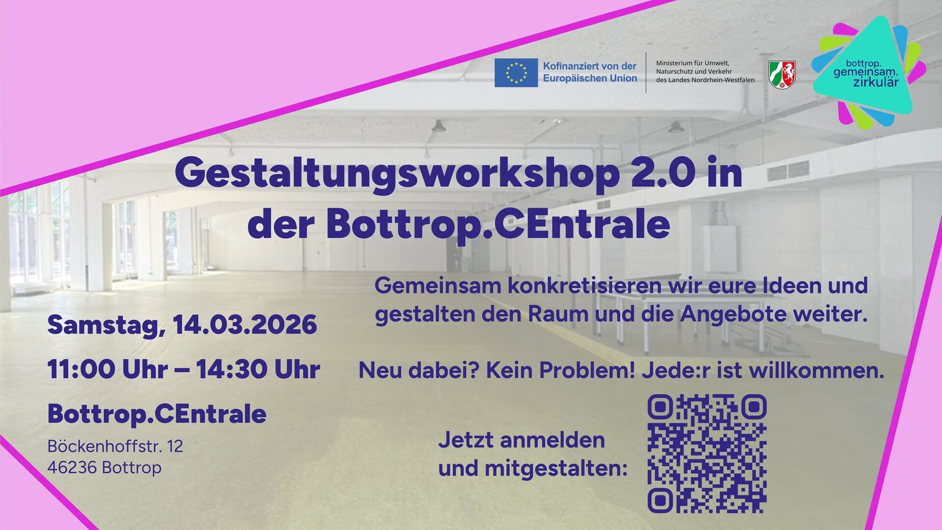 Die Bottrop.CEntrale entsteht als neuer Ort für Austausch, Beteiligung und praxisnahe Angebote, z.B. Reparatur- und Tauschstationen oder ein Werkstattbereich, rund um das Thema Kreislaufwirtschaft – offen, kreativ und mitten in der Stadt. Beim Folgeworkshop sind sowohl Teilnehmende des ersten Workshops als auch weitere interessierte Bürgerinnen und Bürger eingeladen, sich aktiv einzubringen und die zukünftige Nutzung des Ortes mitzugestalten.