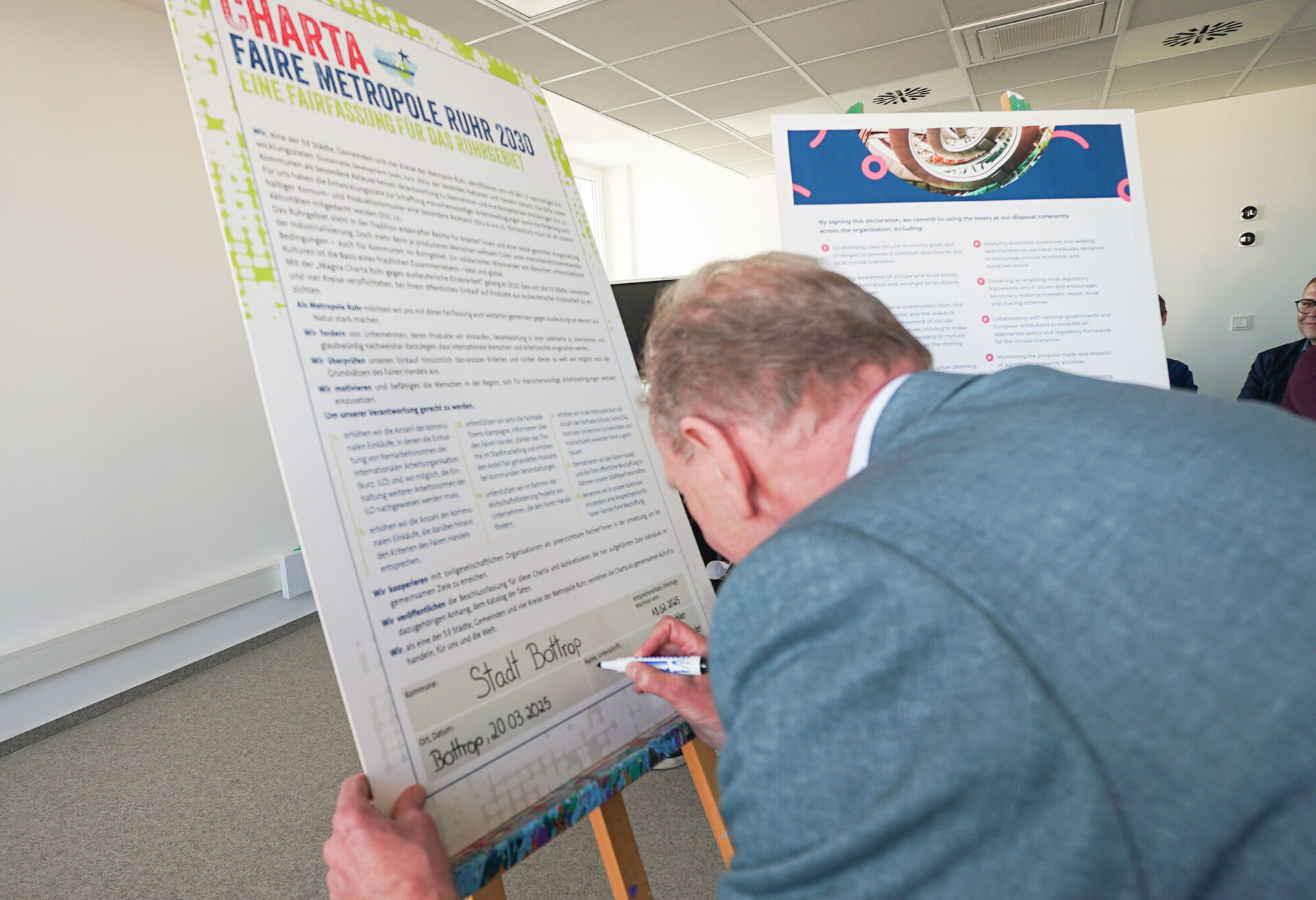 Oberbürgermeister Bernd Tischler hat jetzt zwei Erklärungen unterzeichnet, die die Rolle Bottrops als Motor und Vorbild stärkt. Die Bedeutung der Circular Cities Declaration und der Charta der Fairen Metropole Ruhr 2030 spiegelte sich in der Feierstunde wider. Zahlreiche Vertreter:innen aus verschiedenen Bereichen der Stadtgesellschaft kamen in den Sitzungsraum der Wirtschaftsförderung und würdigten den damit angestoßenen Transformationsprozess.