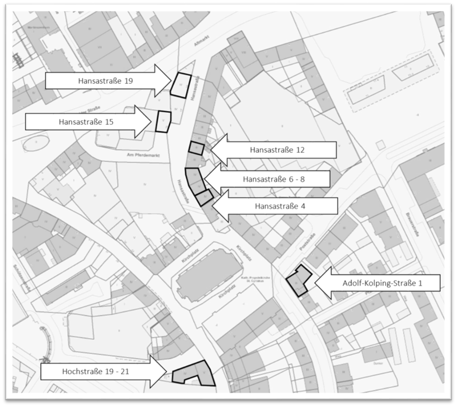 Das Programmgebiet „Hansaviertel“ orientiert sich an der Gebietskulisse des Sanierungsgebietes Hansaviertel und umfasst die Bereiche Poststraße, Kirchplatz, Hansastraße, Am Pferdemarkt, Osterfelder Straße, Hochstraße und Berliner Platz.