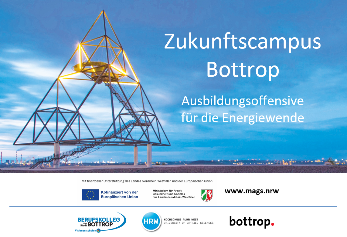 Der Zukunftscampus Bottrop ist ein Modellprojekt zur Verzahnung von beruflicher und akademische Bildung im Bereich erneuerbare Energiesysteme zusammenbringt. Ziel ist eine praxisnahe Ausbildung für die Energiewende – mit modernen Lernorten, digitalen Formaten und flexiblen Lehrkonzepten.