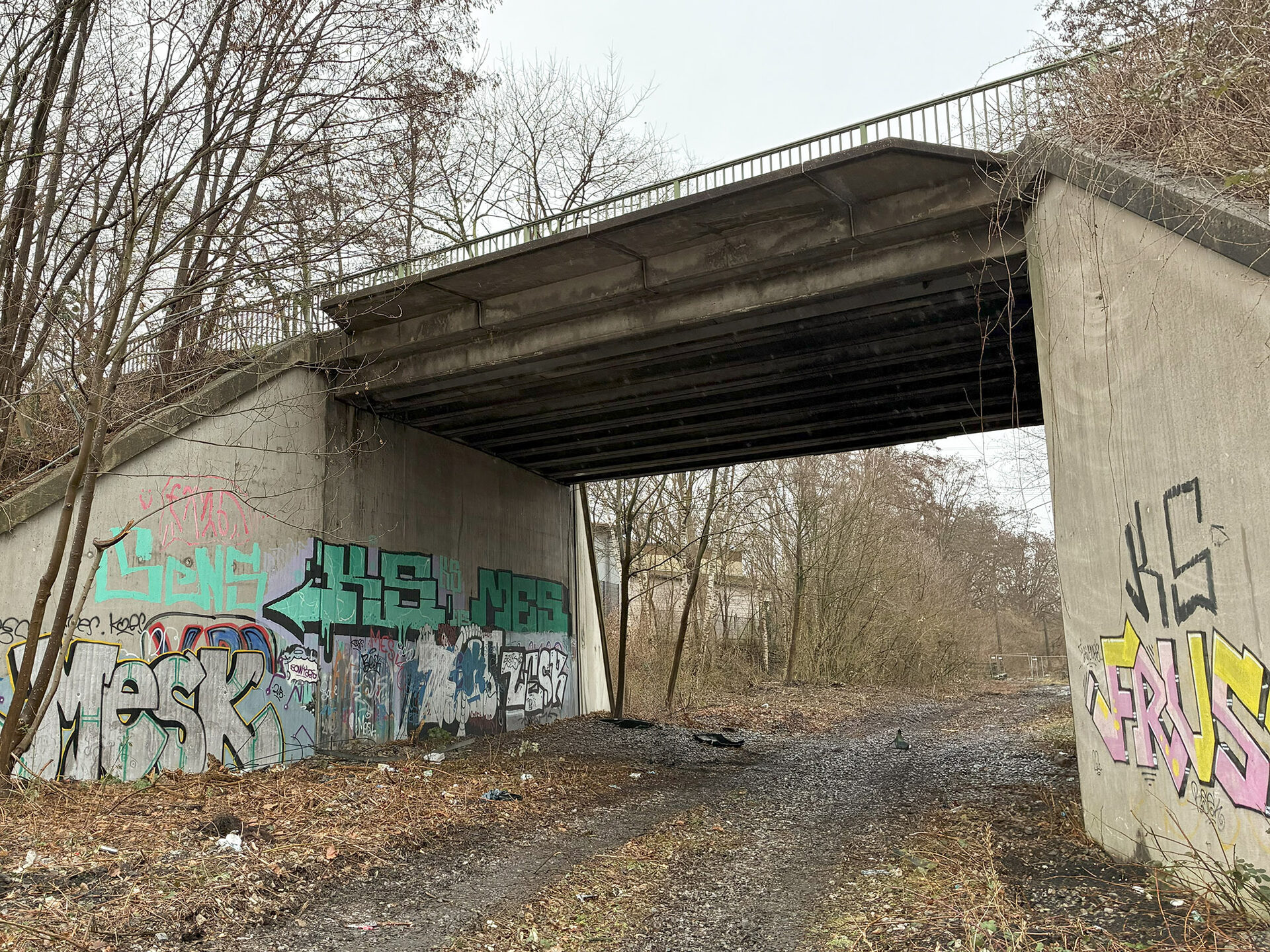 Die Brücke über die ehemalige Bahnstrecke ist beschädigt, wird aber zügig saniert. Derzeit gibt es eine Baustellenampel, doch die Straße kann in beiden Fahrtrichtungen noch befahren werden.