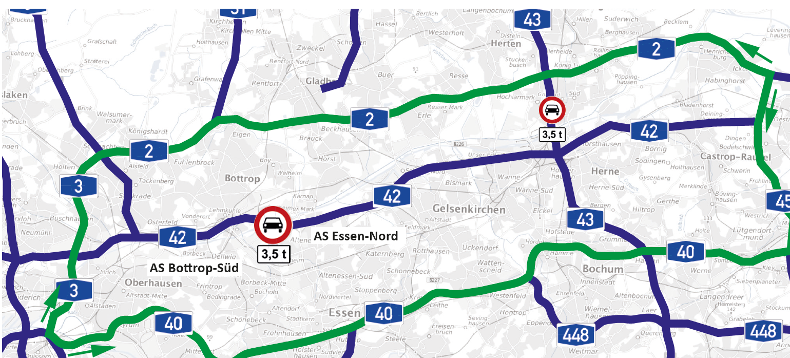 Der Fernverkehr wird großräumig umgeleitet und soll die A42 erst gar nicht benutzen. Umleitungsstrecken führen über die A2, A3, A40 und A45.