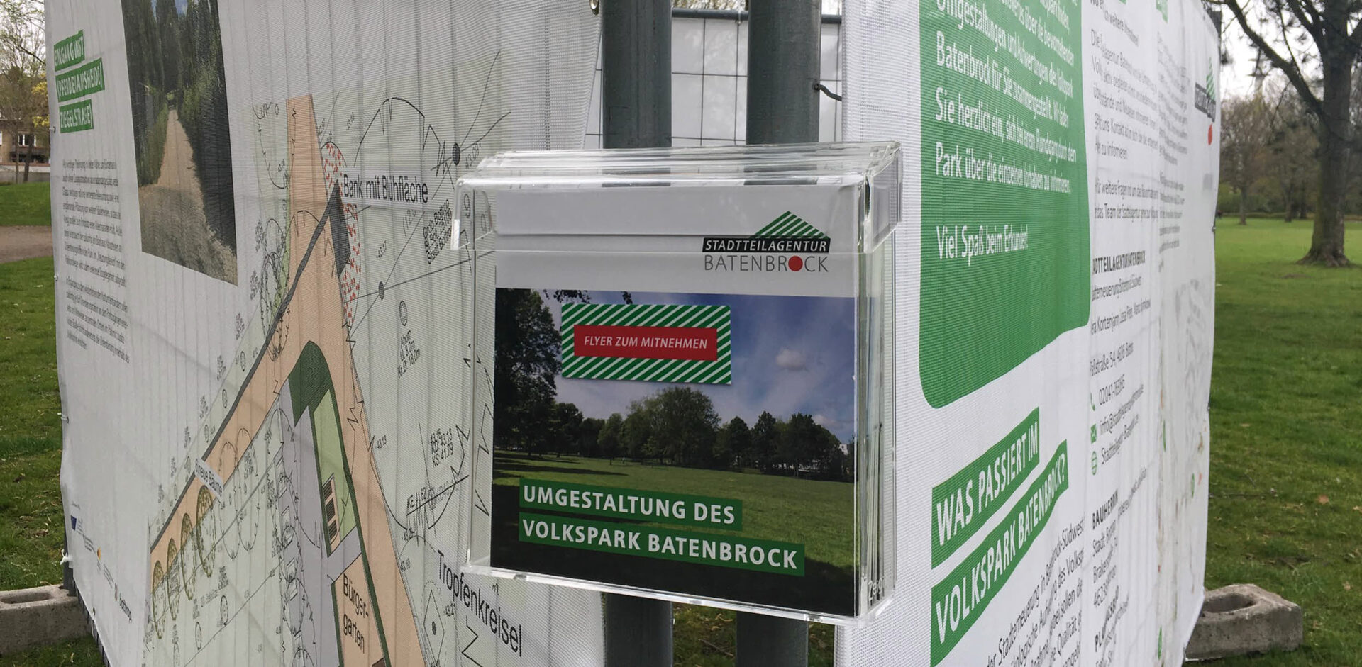 Zur Bewerbung und zur Information über die einzelnen Projekte und Maßnahmen wurden verschiedene Informationsmaterialien wie Flyer, Plakate, Postkarten und Bauzaunbanner genutzt. Alle Printprodukte wurden im Umfeld der Maßnahme verteilt und zugleich auf der Website zur Stadterneuerung in Batenbrock bereitgestellt. Die Website enthielt darüberhinausgehende Informationen und wurde regelmäßig aktualisiert.
